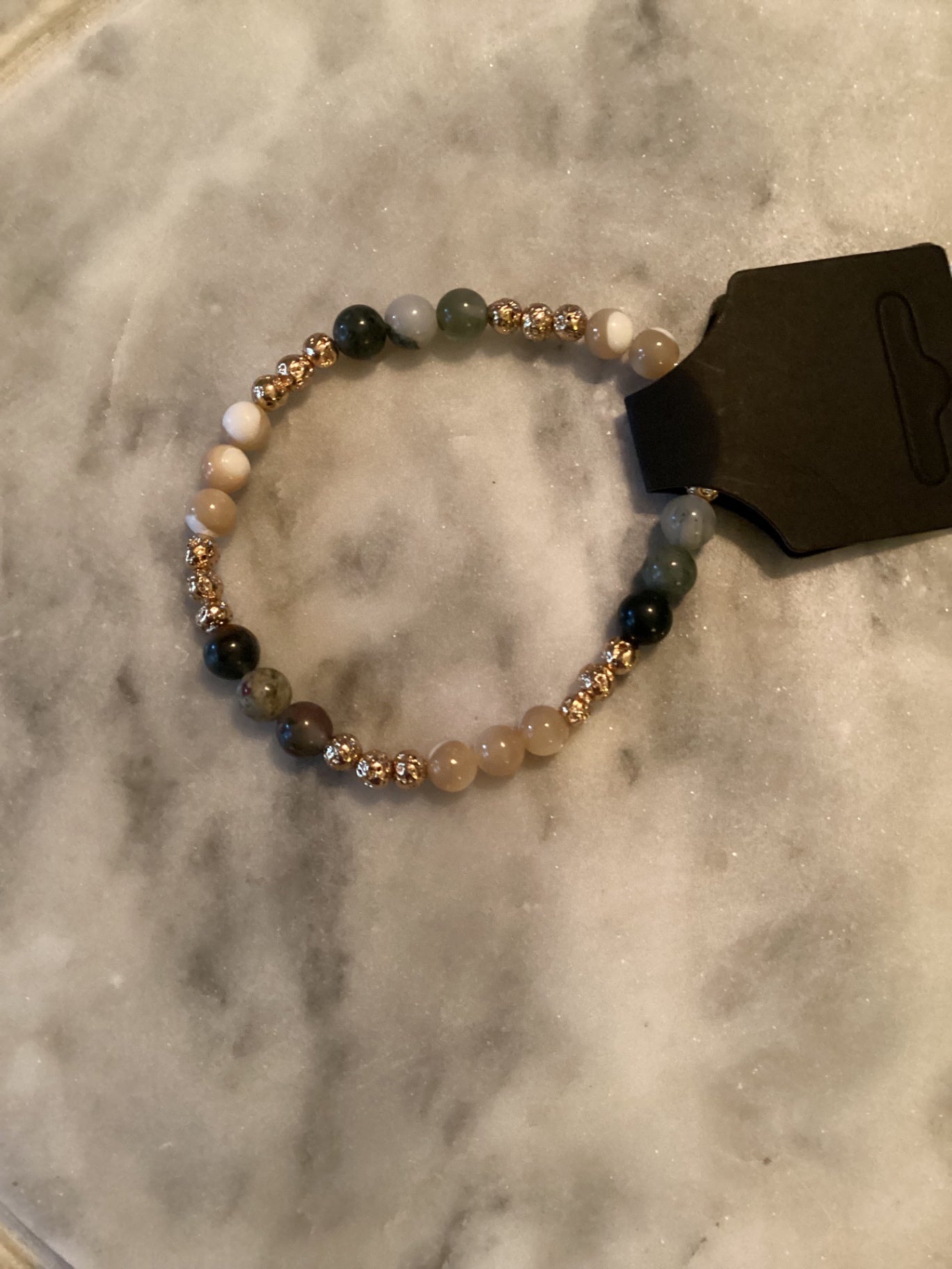Discover the elegance of this beaded bracelet, combining bloodstone beads with shell and shimmering gold plated lava accents for a sophisticated touch. Perfect for layering or wearing as a standalone accessory, it adds a subtle sparkle to any outfit. Its versatile color palette makes it suitable for both casual and formal looks. Crafted to highlight style and simplicity, this bracelet is a must-have for jewelry enthusiasts.