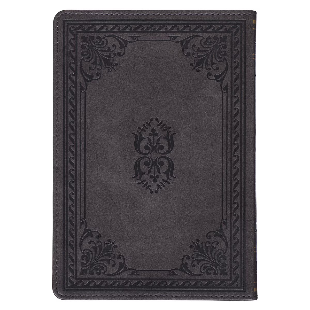 The gift book's stone-gray faux leather cover is decorated with an elaborate heat-debossed frame accented by intricate corner scroll designs. The title is presented in gold-foiled letters.