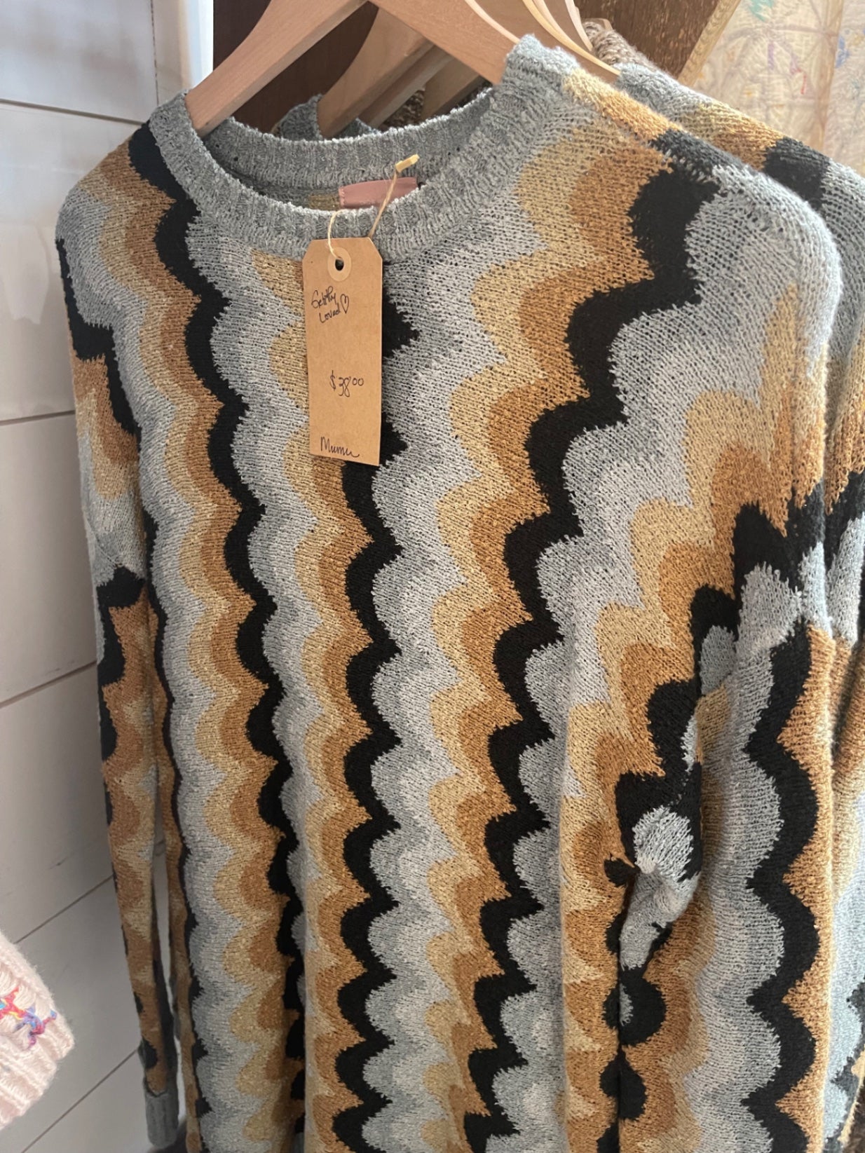 This vibrant knitted sweater showcases a striking zigzag pattern in earthy tones. Crafted from a cozy knit, it offers warmth with a stylish, vintage-inspired vibe. Perfect for layering during the cooler months, its bold design adds a touch of retro charm to any casual wardrobe. An easygoing piece that balances comfort with eye-catching appeal, making it a versatile addition to your everyday outfits.