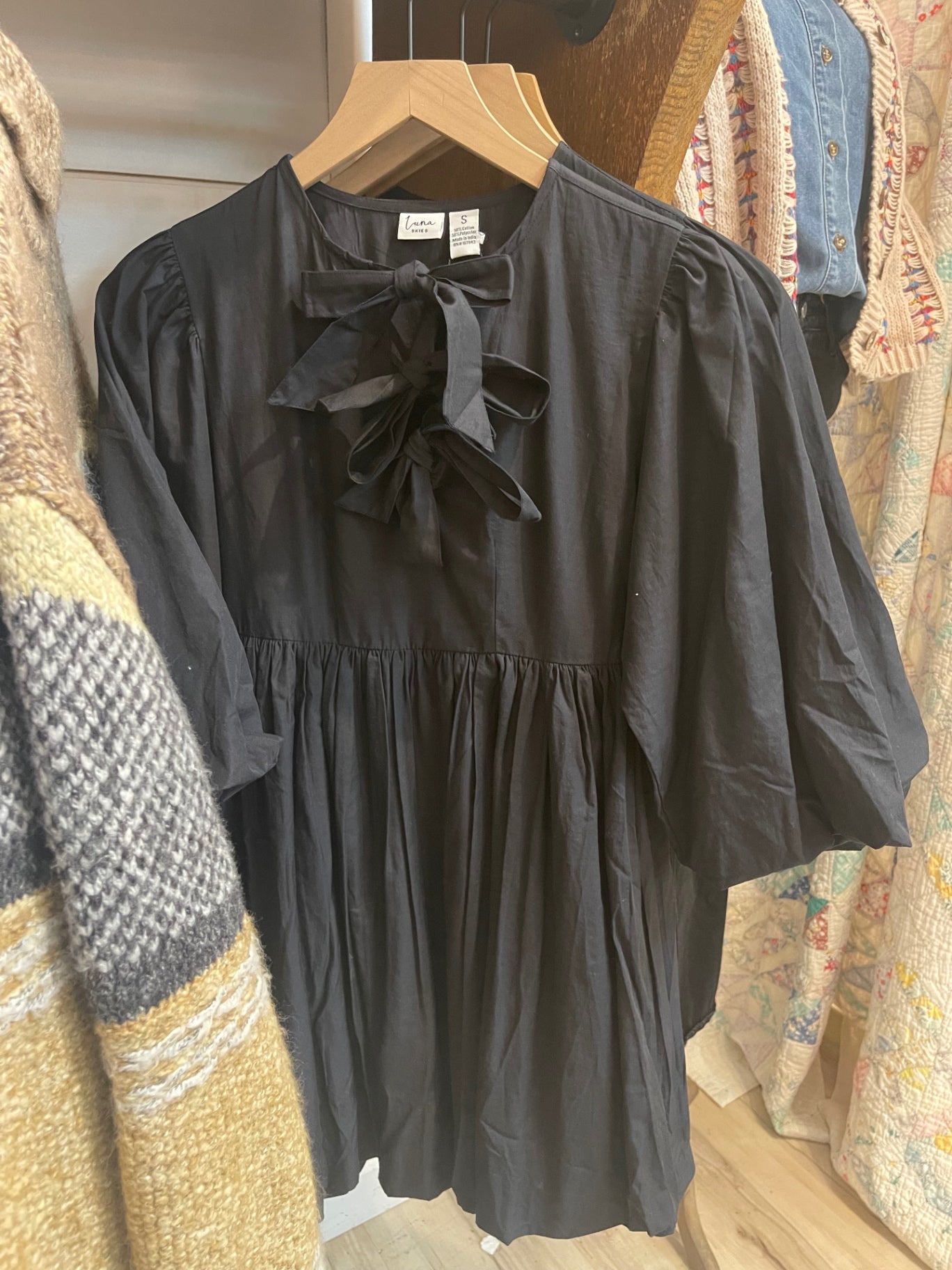 This stylish black dress by Luna features a charming bow at the neckline, adding a feminine touch. The puffed sleeves and gathered skirt create a playful yet chic silhouette, perfect for both casual and semi-formal occasions. Crafted from a lightweight material, it offers comfort and breathability. The versatile black shade makes it easy to style with various accessories for different looks. An excellent choice for those who love classic fashion with a modern twist.