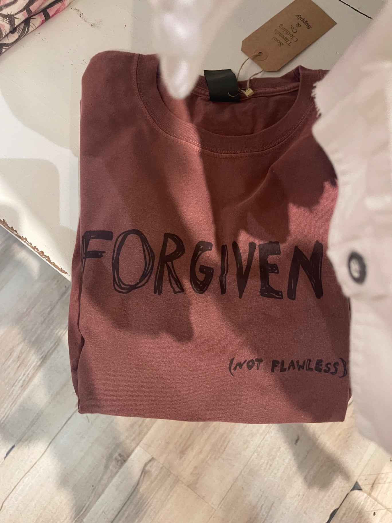 This trendy pink T-shirt features bold black text that reads 'FORGIVEN (NOT FLAWLESS)' adding a statement-making touch to casual wear. Crafted from soft cotton, it offers all-day comfort and effortless style. Perfect for pairing with jeans or shorts for a relaxed, youthful look. Its simple yet impactful design makes it a versatile addition to any wardrobe. Ideal for those who want to express confidence and authenticity.