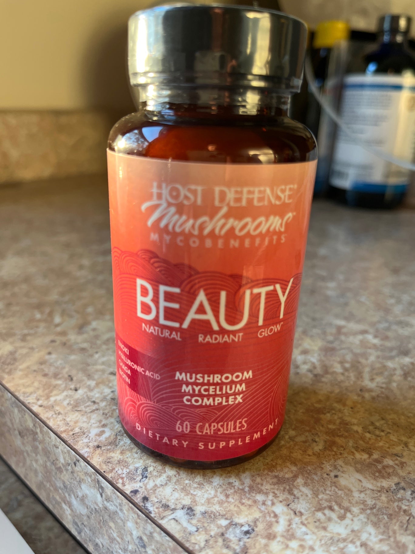 This dietary supplement in capsule form features a blend of mushroom mycelium complex designed to support skin radiance and overall beauty. The capsules contain ingredients like hyaluronic acid and biotin, aimed at enhancing natural glow and hydration. Perfect for a beauty routine, this product emphasizes immune health while promoting luminous skin. Its vibrant packaging reflects its focus on natural and radiant beauty benefits. Ideal for those interested in holistic skincare and wellness.