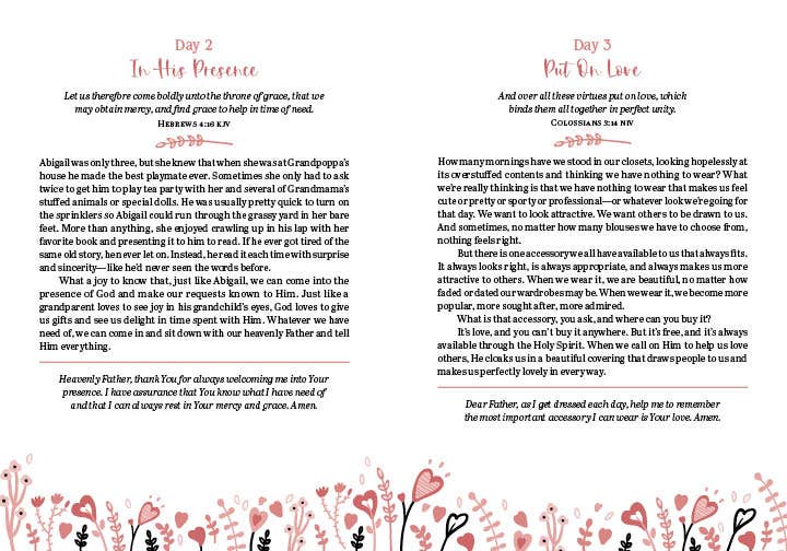 This beautiful daily devotional collection will engage your spirit with Bible wisdom and encouraging devotions. Each day's reading includes a scripture, faith-nurturing devotion, and prayer—all designed to draw you closer to your Father God through daily quiet time.