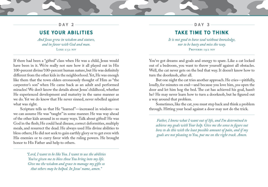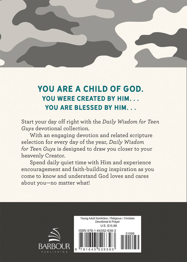 With an engaging devotion and related scripture selection for every day of the year, Daily Wisdom for Teen Guys is written especially for teens ages 13 and up. Spend daily quiet time with Him and experience encouragement and faith-building inspiration as you come to know and understand God loves and cares about you—no matter what!