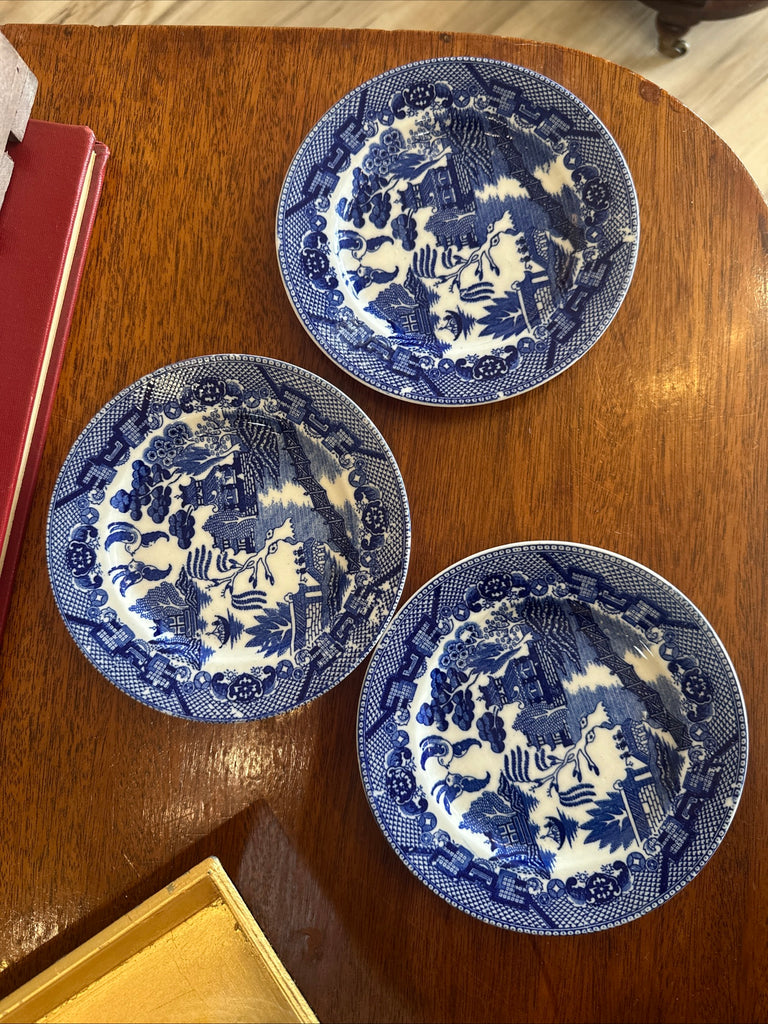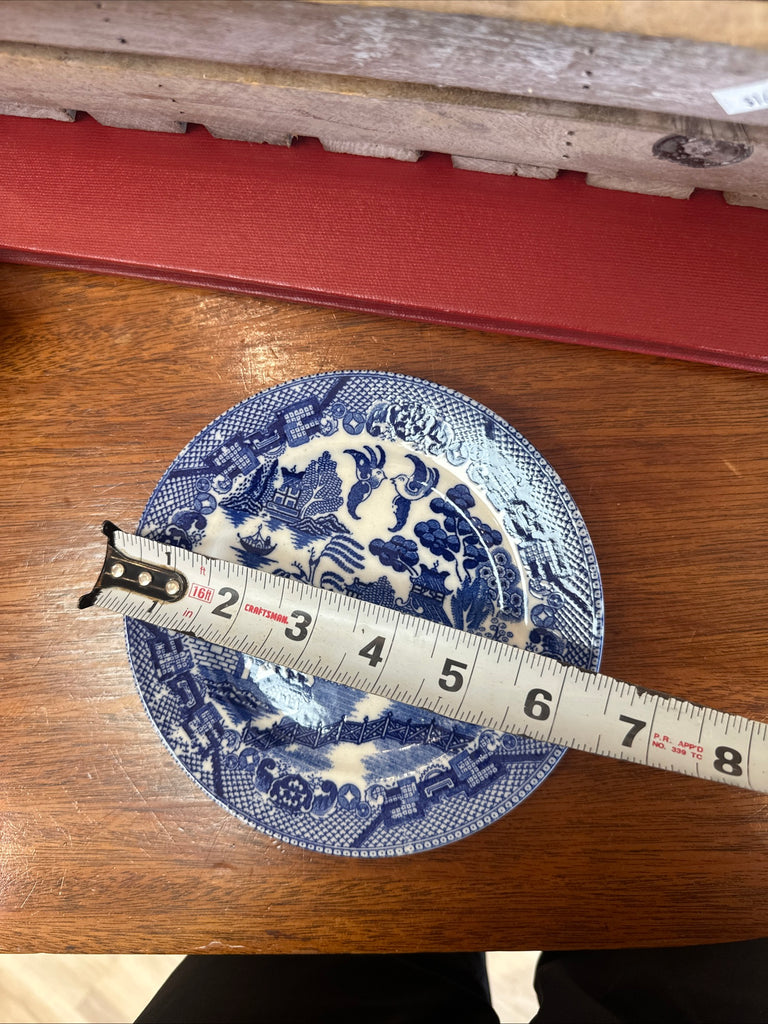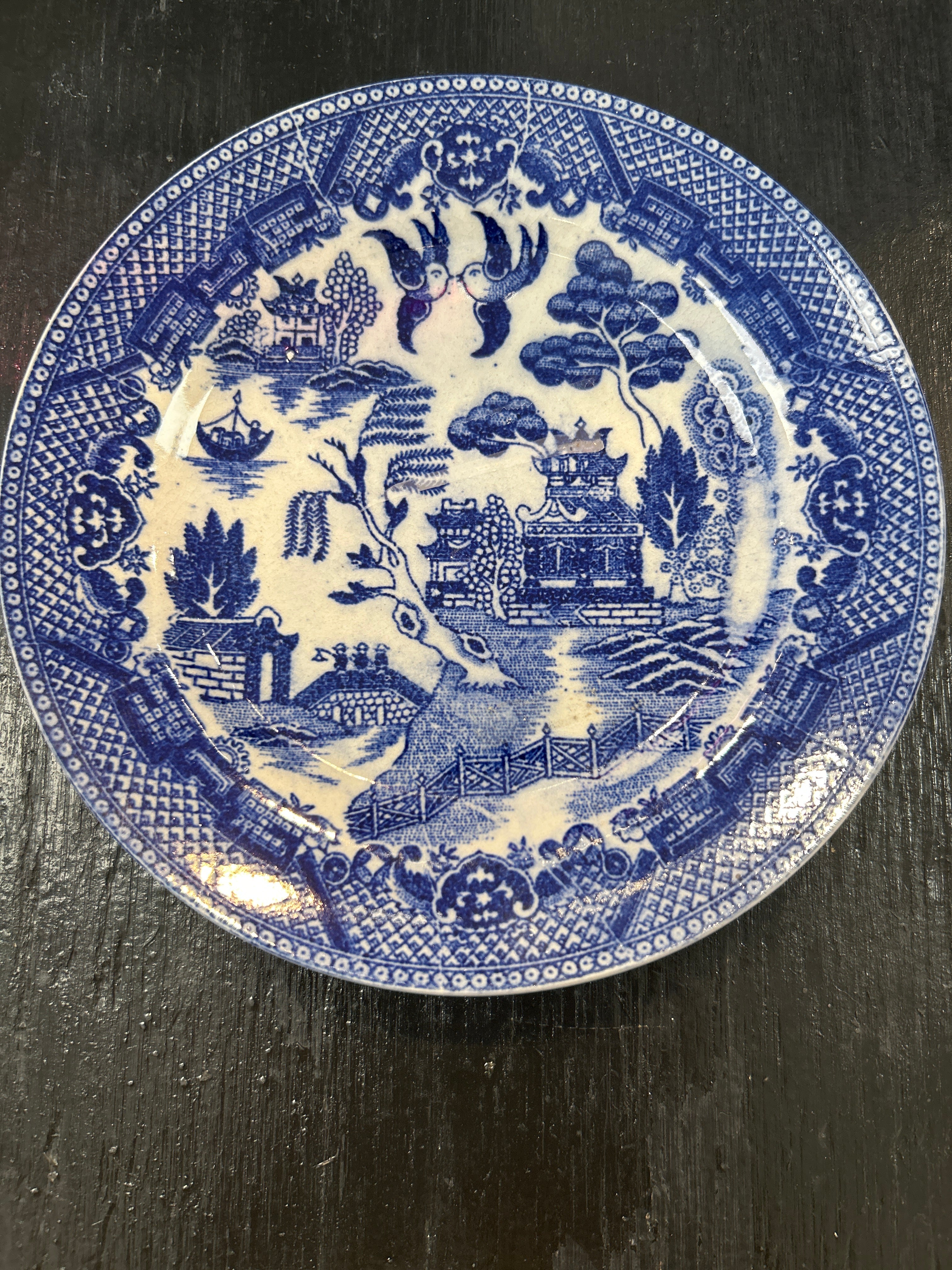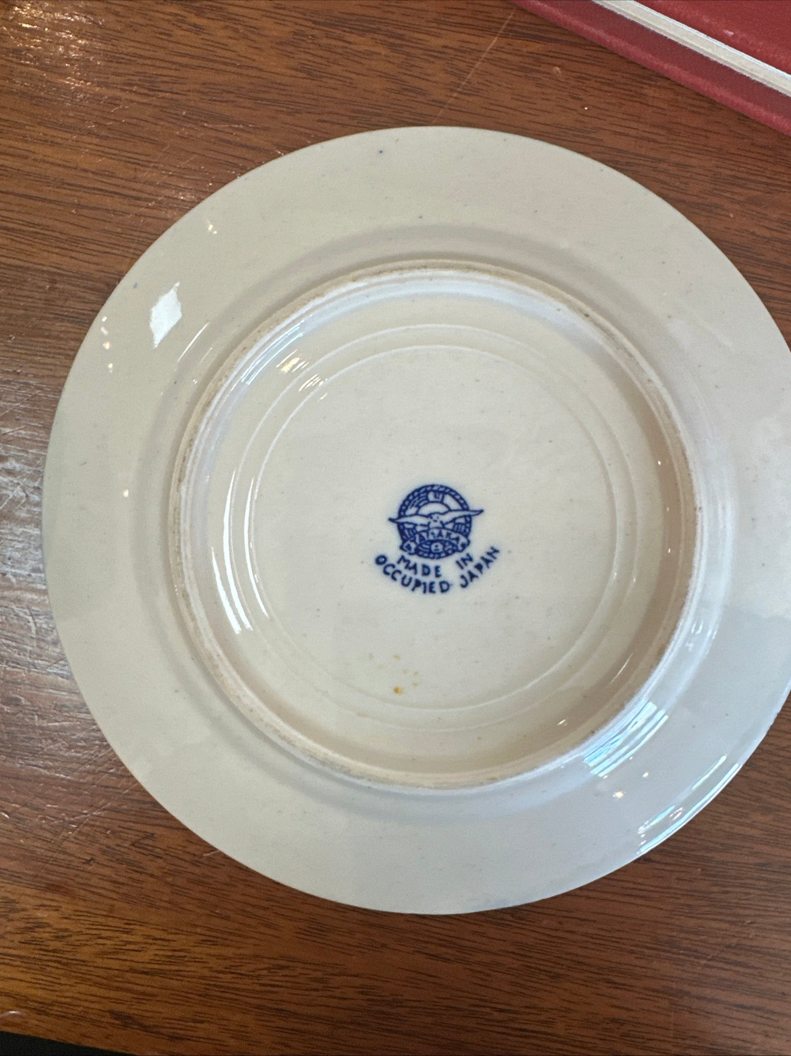 This Blue Willow saucer, marked "Made in Occupied Japan," features the timeless blue and white pattern that has delighted collectors for decades. Its delicate design and historical significance make it a unique addition to any China collection or a charming accent for your dining experience. Ideal for those who appreciate vintage ceramics with a story.