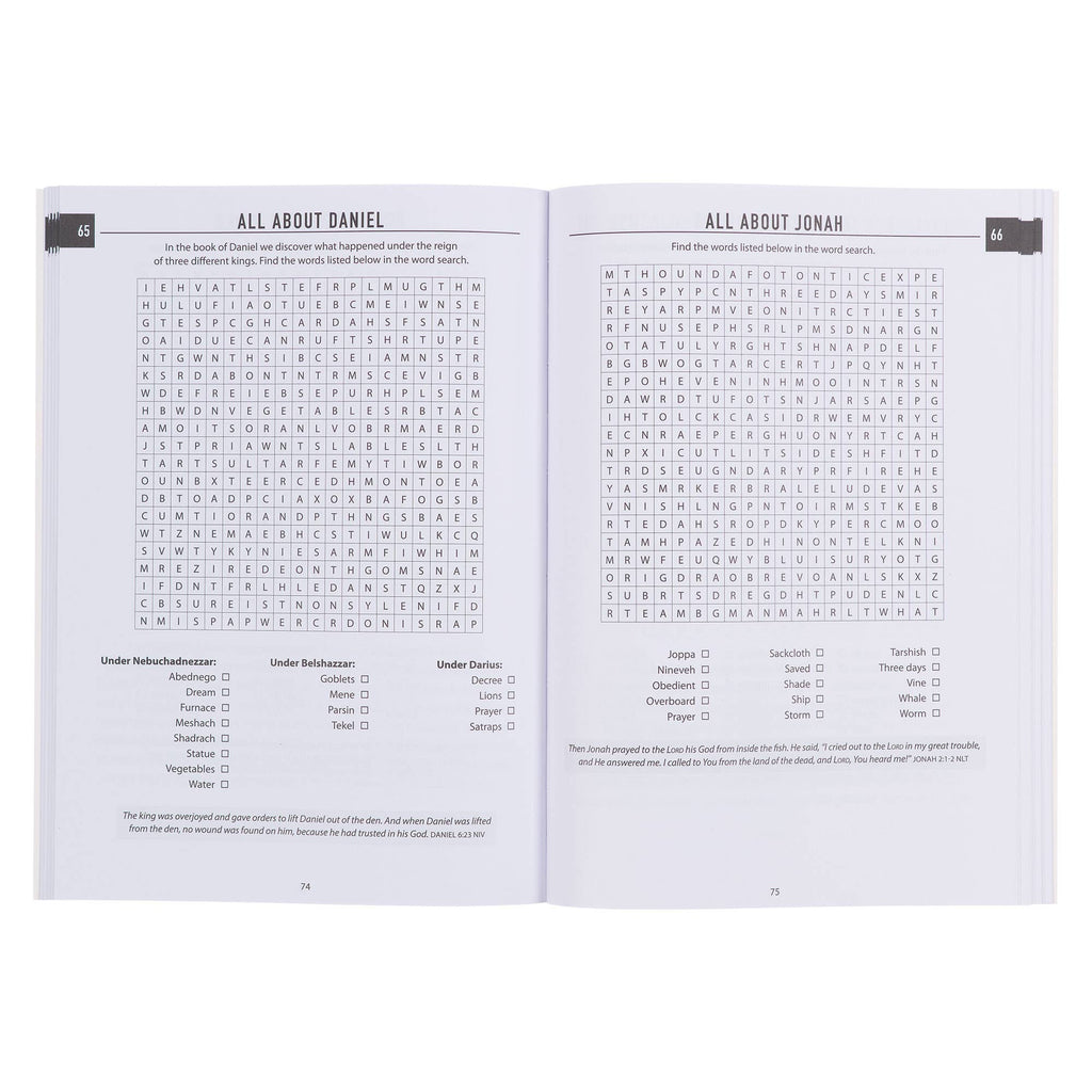 The interior pages are white, printed in black, and contain 100 captivating word searches. These puzzles vary in difficulty and cover biblical topics from Genesis to Revelation. Not only will you relax and unwind as you search for the words, but you will also discover interesting facts about Bible times, places, and people. Each word search has a Scrip