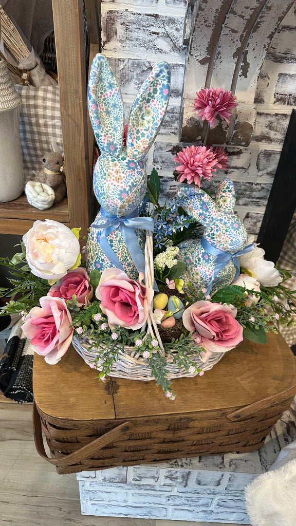 Custom Floral Arrangement 2 Floral bunnies in a basket blue mauve combo