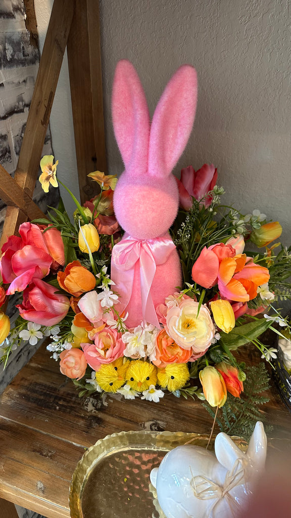 Add some festive spring cheer with this custom floral arrangement featuring a bright pink flocked bunny and delicate chicks. Perfect for brightening up any room or as a unique gift for a loved one.