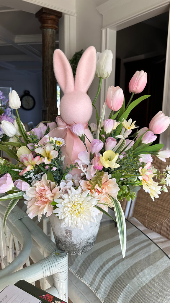 Decorate your space with our custom floral arrangement featuring a charming pink flocked bunny surrounded by delicate tulips. Perfect for adding a touch of whimsy and springtime cheer to any room or as a thoughtful gift for a loved one.