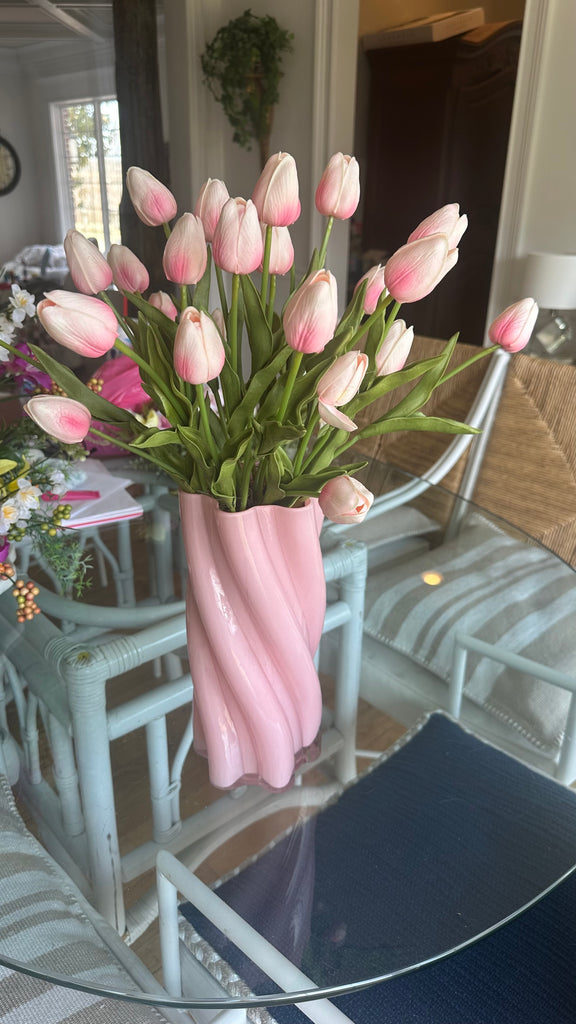 Create a personalized touch to your home decor with our custom floral arrangement featuring beautiful pink tulips in a lovely glass pink vase. Adorn any space with this elegant and vibrant touch of nature.
