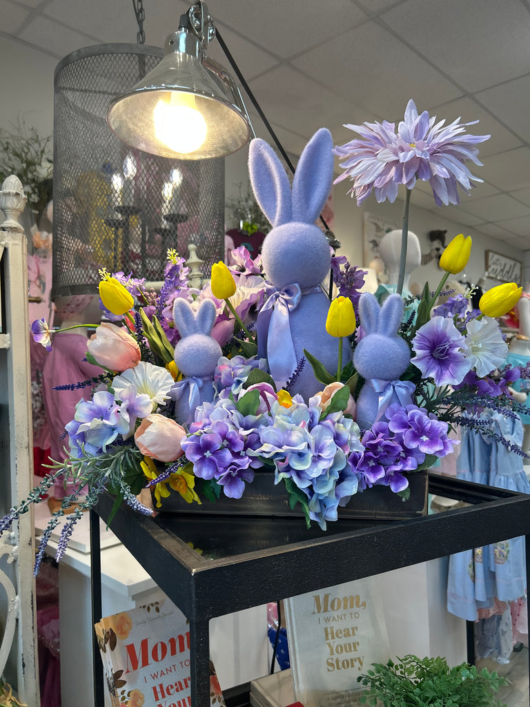 Enhance your spring decor with our delightful Custom Floral Arrangement featuring a purple flocked bunny family surrounded by vibrant tulips. Perfect for adding a touch of whimsy and color to any room or event. Hand-crafted with care, this arrangement is sure to impress and bring joy.