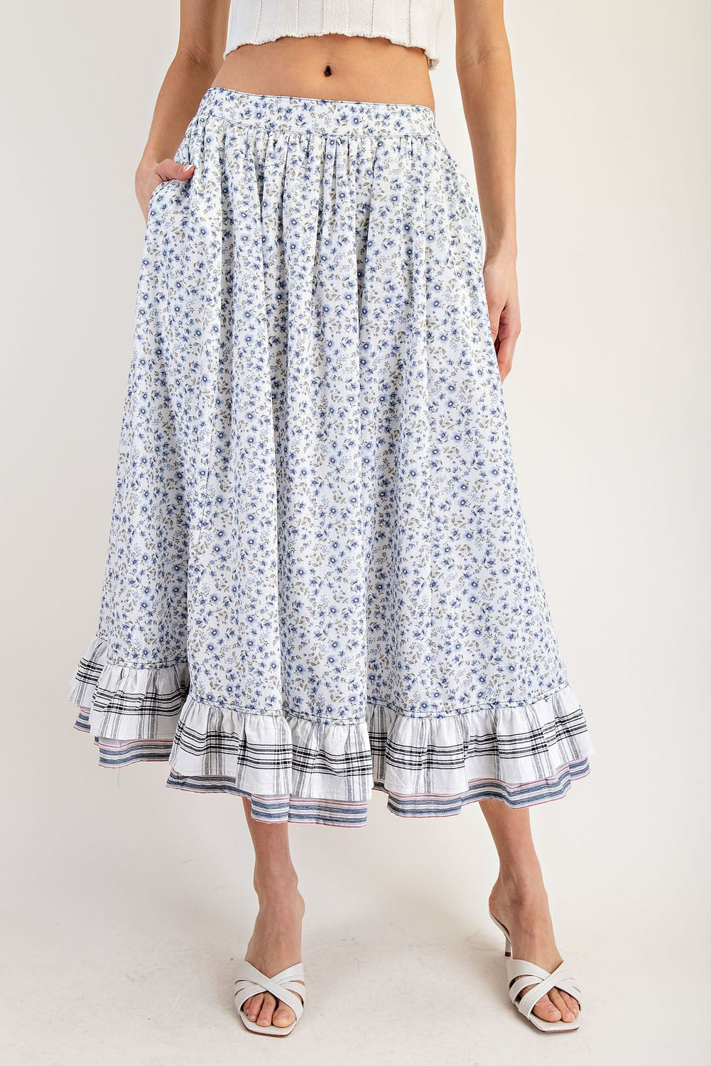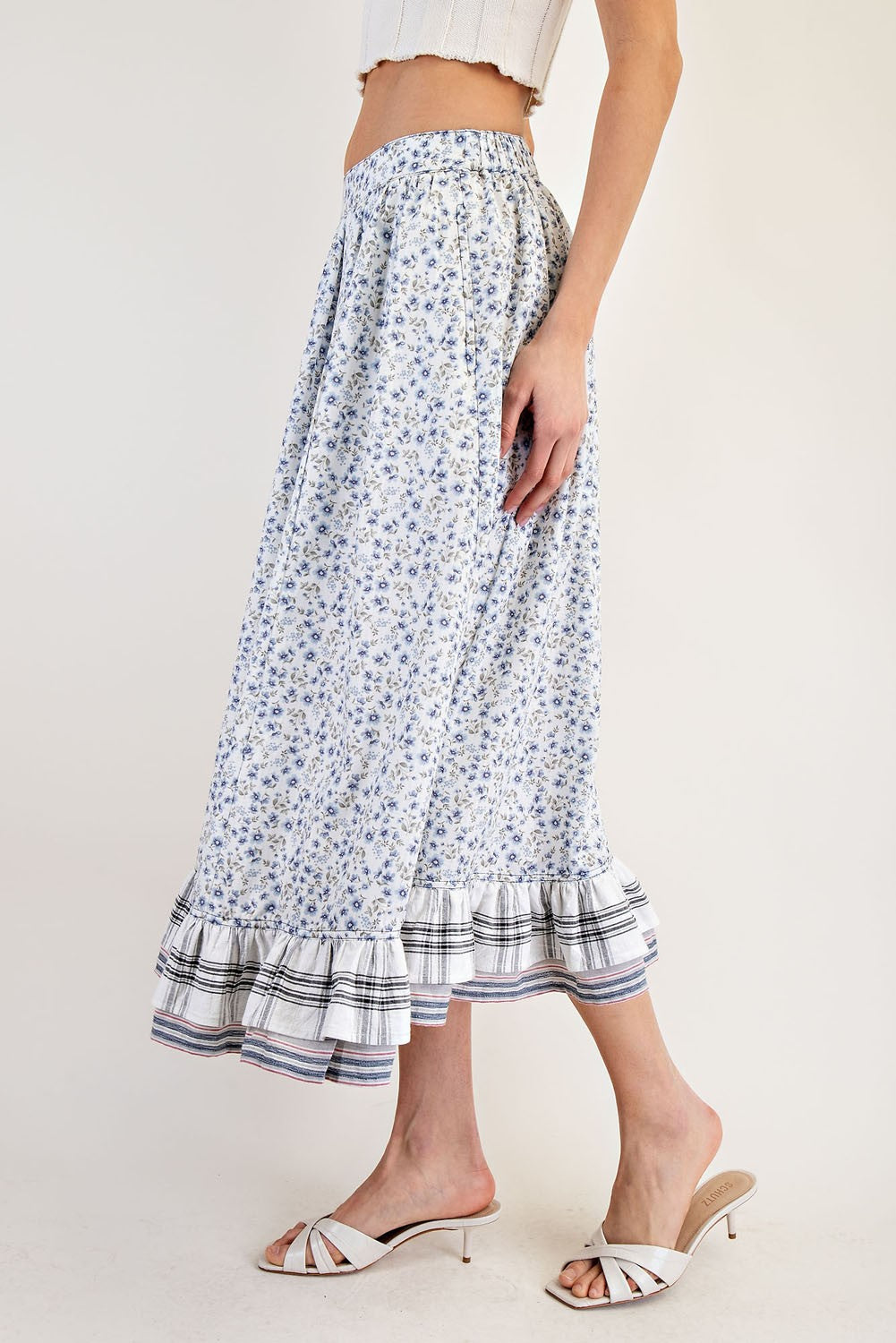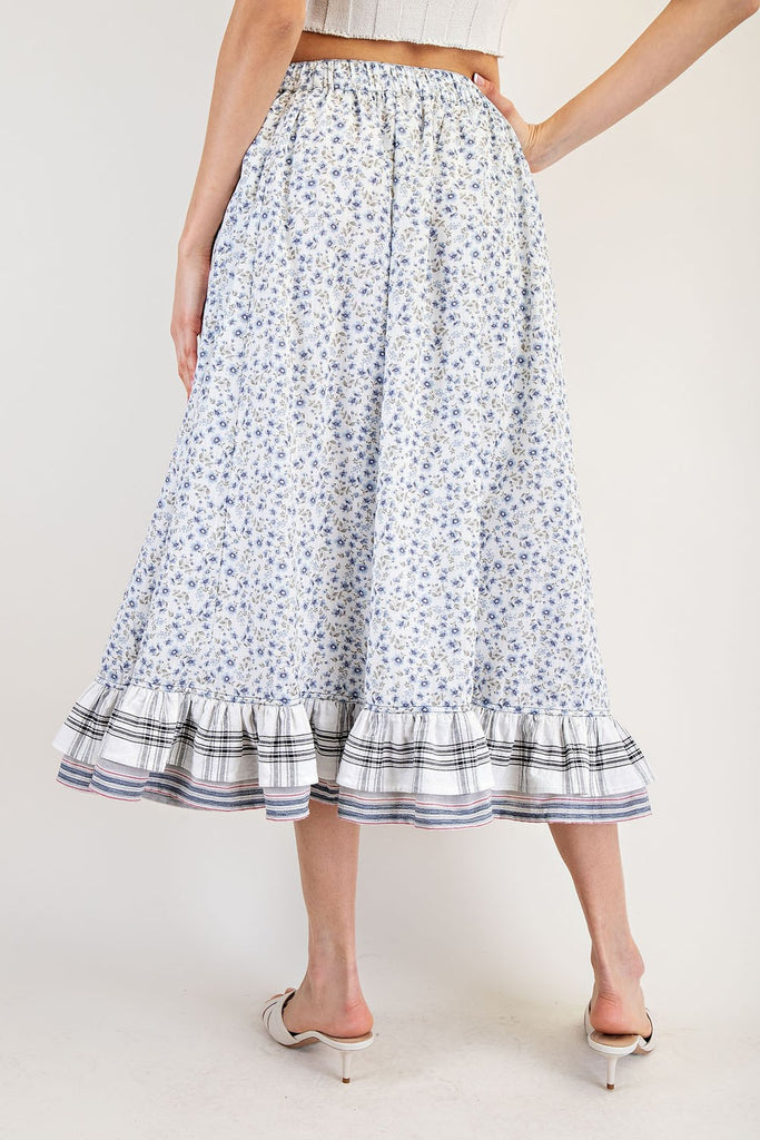 This floral midi skirt boasts a vintage-inspired design with a flattering A-line silhouette and a delicate floral print. The comfortable elastic waistband and functional side pockets add practicality, while the plaid ruffle hem adds a unique touch. Perfect for adding a touch of femininity to any outfit.