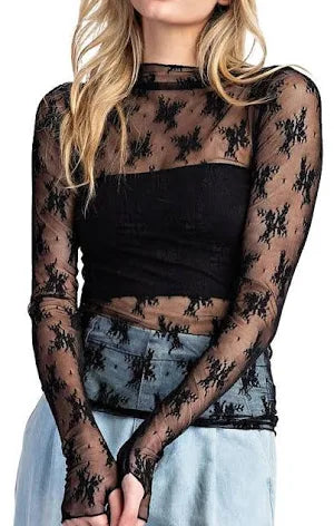 Elevate your style with our long sleeve lace top. Designed with a mock neckline and thumb holes, this top adds a touch of sophistication and unique detail to your outfit. Perfect for any occasion, the relaxed yet fitted silhouette will keep you comfortable and stylish all day long.