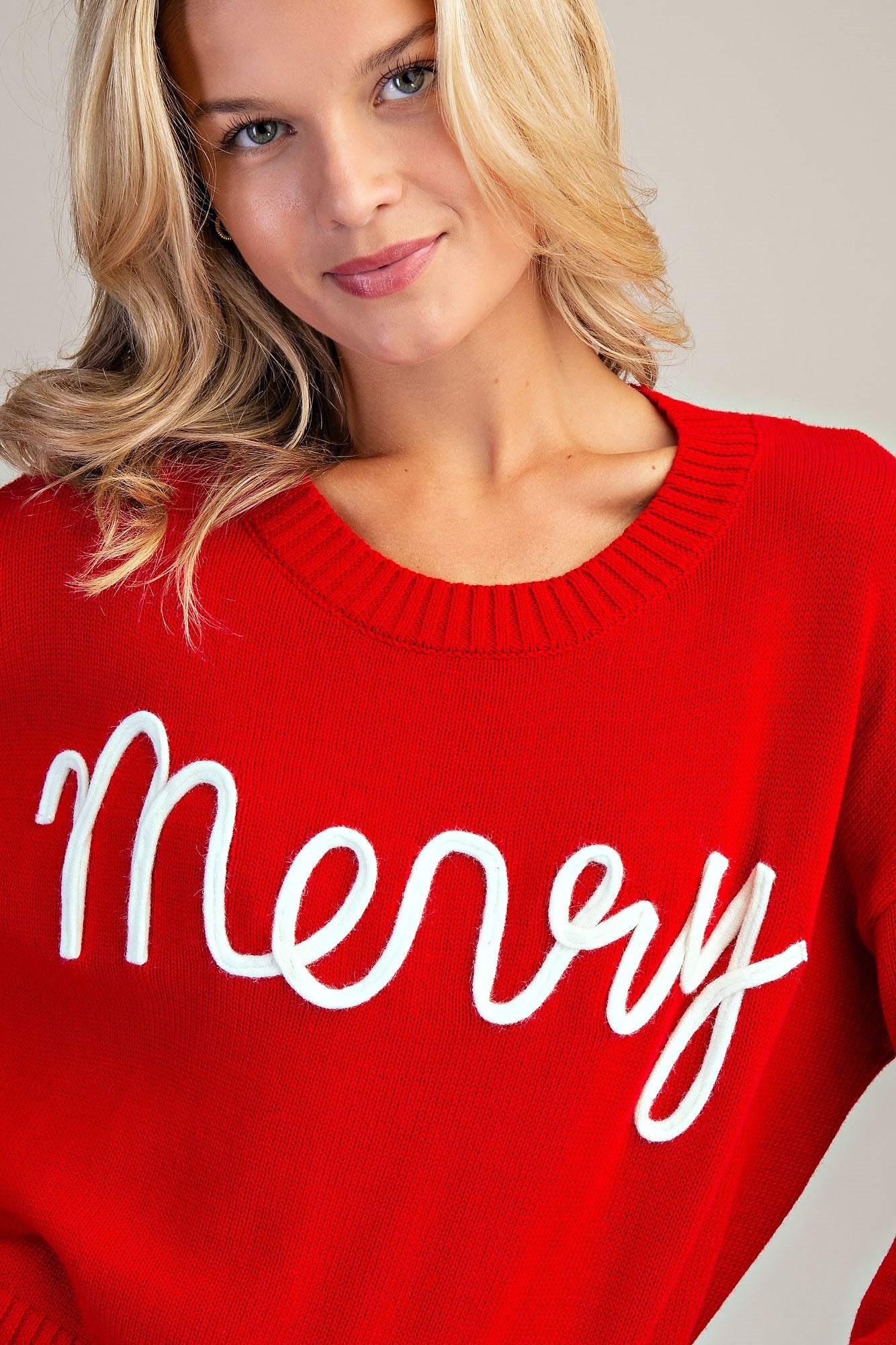 This festive knit sweater features a bold crew neckline, dropped shoulders, ribbed hem and cuffs, and playful 'Merry' lettering across the front with two distinctly styled 'r's for a charming, hand drawn effect.