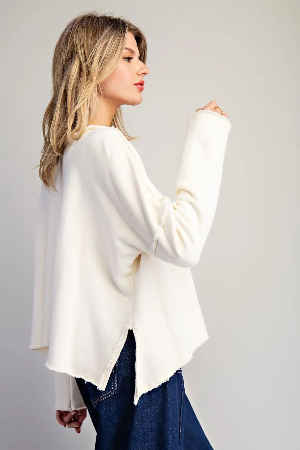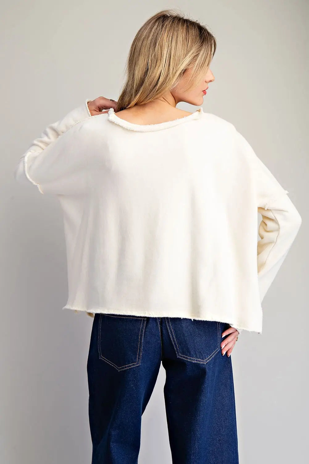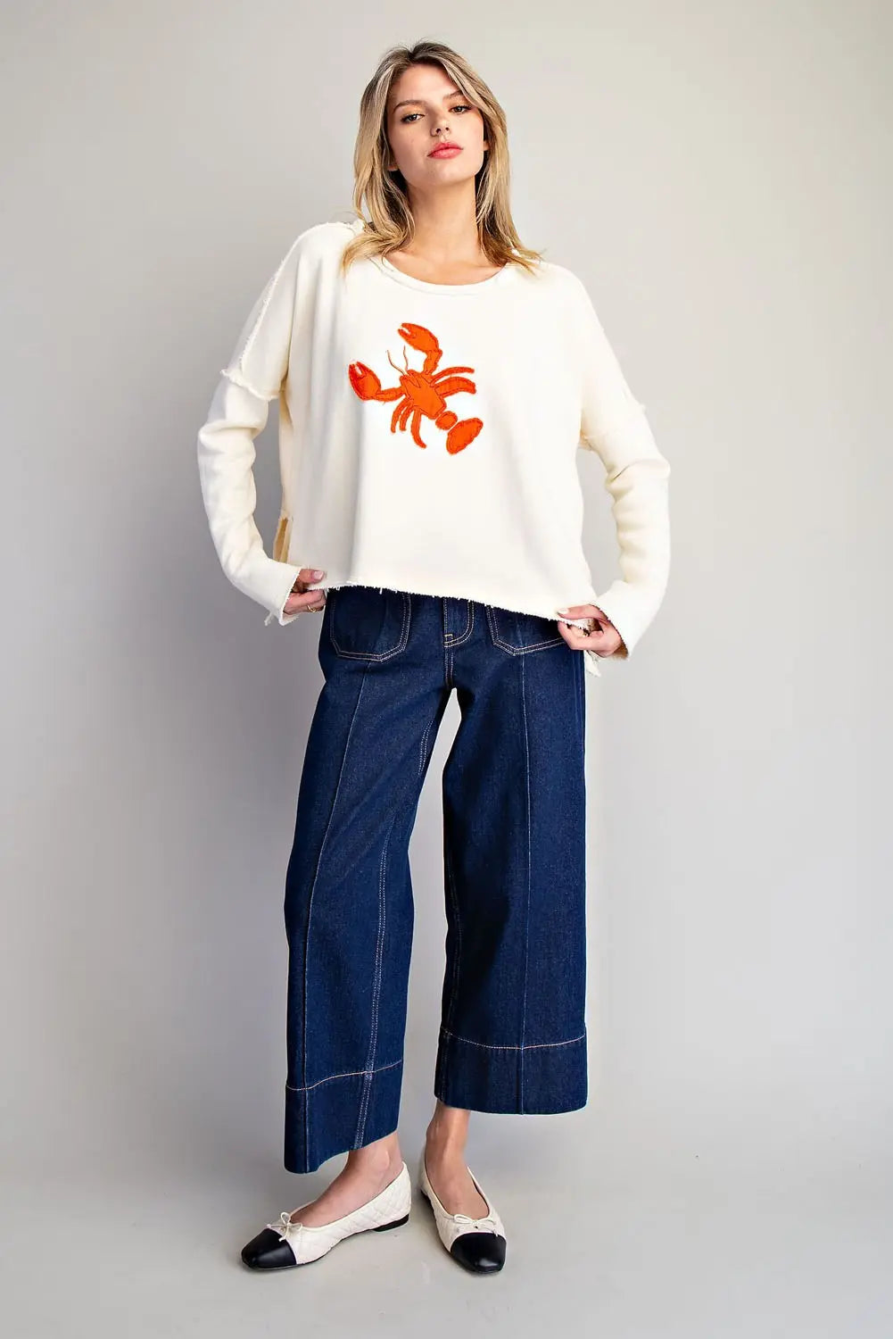 This mineral washed top features a relaxed, boxy silhouette with exposed reverse seams, a raw edge scoop neckline, long sleeves, and an oversized embroidered lobster patch at the center front, finished with distressed hems and high side slits for a quirky cool coastal look.