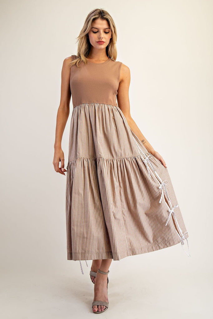 This mixed media midi dress features a ribbed knit sleeveless bodice with a center back zipper, contrasted by a voluminous tiered poplin skirt with vertical stripe panels, delicate side bow ties, and side pockets for a feminine yet playful silhouette.