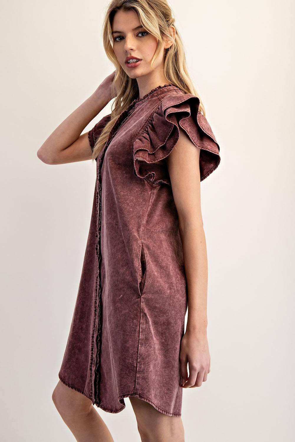 This mini dress features a snow, enzyme, stone, and bleach wash for a unique, worn-in look. It has a ruffled mock neckline, layered flutter sleeves, and a full button-down front with frayed trim detailing. Two side hip pockets add practicality, while the A-line silhouette offers a flattering and feminine fit perfect for everyday wear.