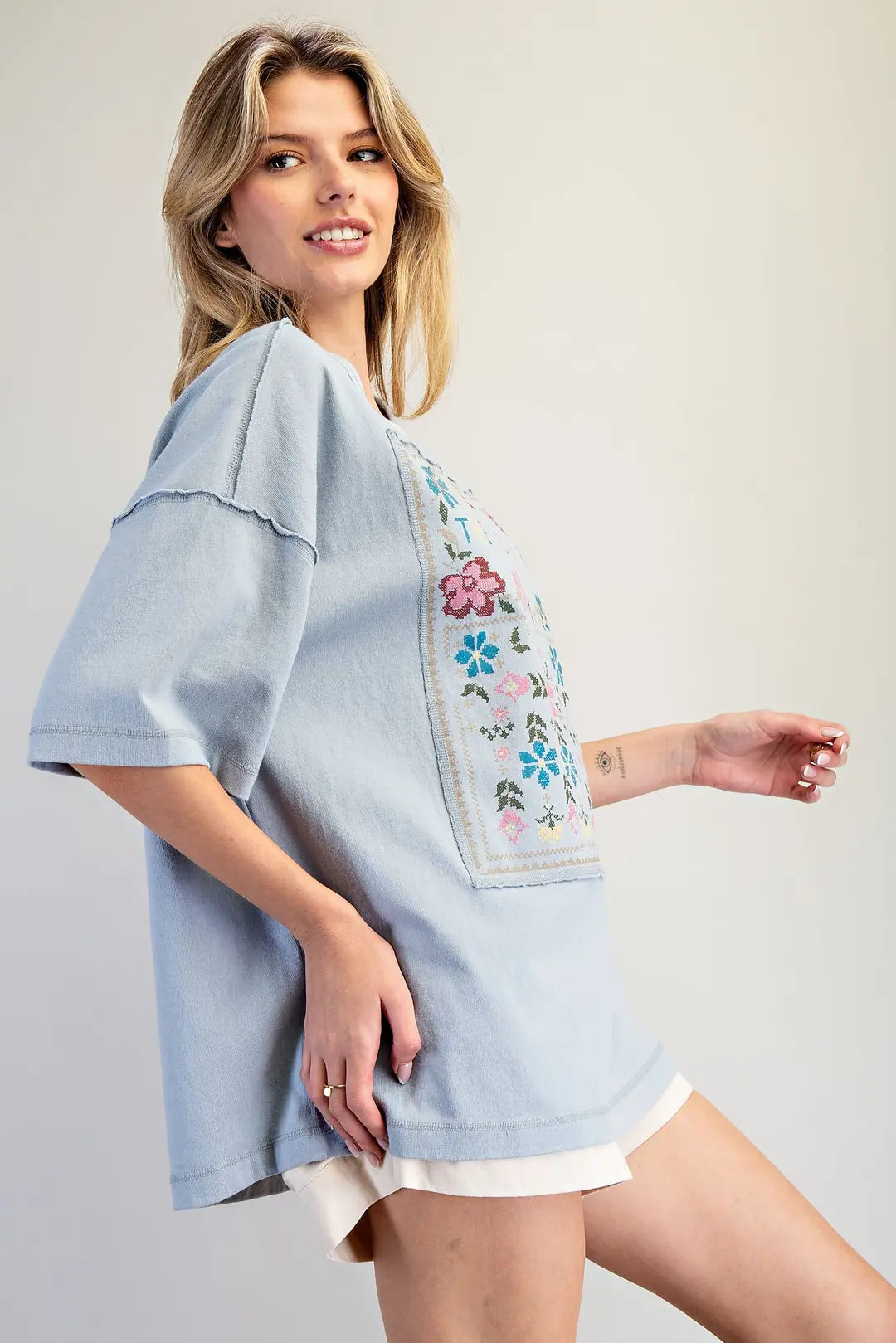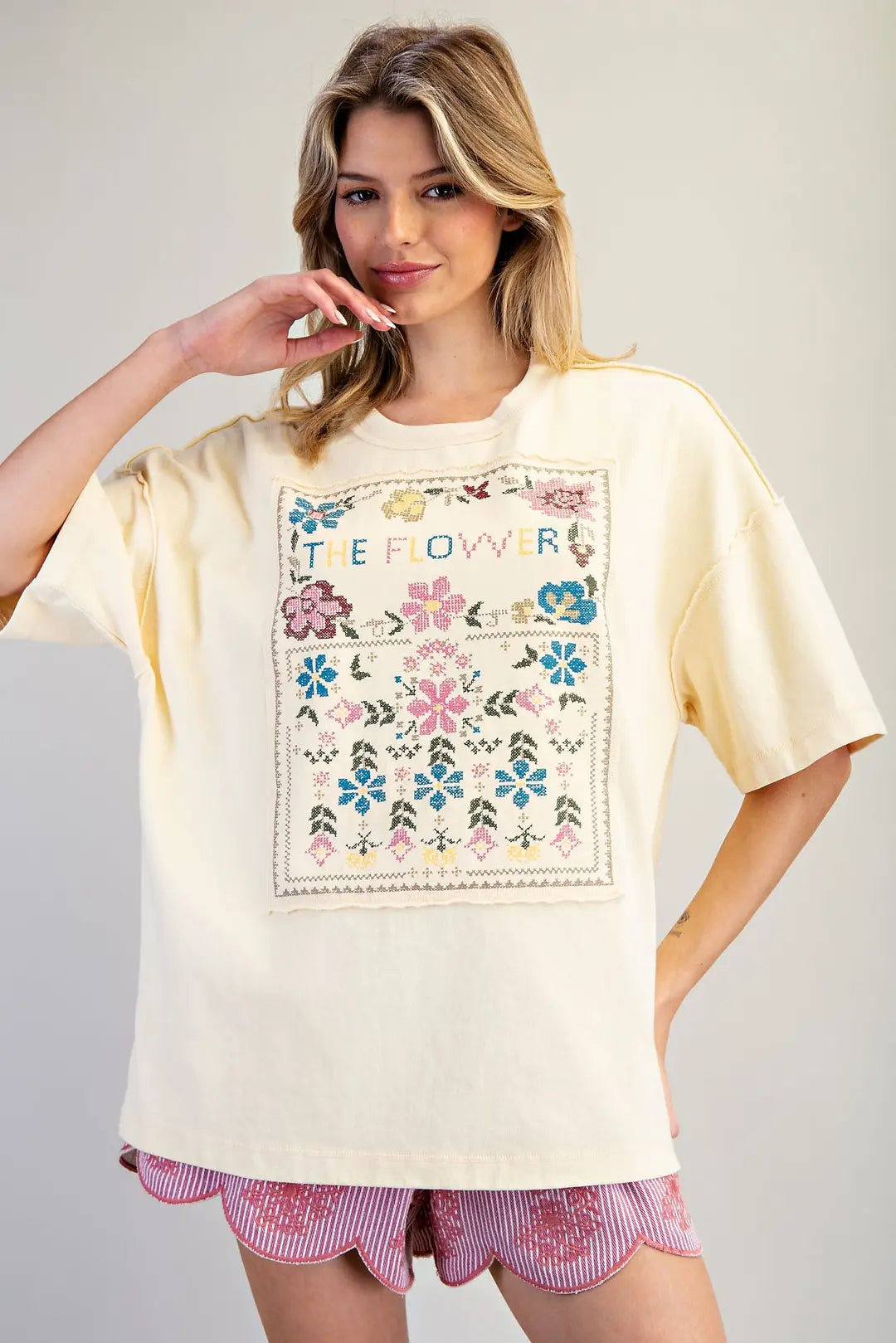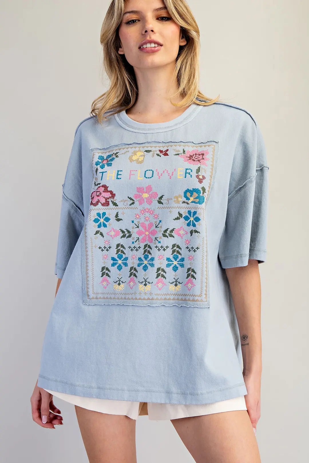This soft washed oversized tee features a relaxed drop shoulder silhouette with raw seam detailing, a bold cross stitch floral graphic panel across the front, a matching embroidered triangle accent at the back neckline, and a straight hem for a soft, vintage inspired look.