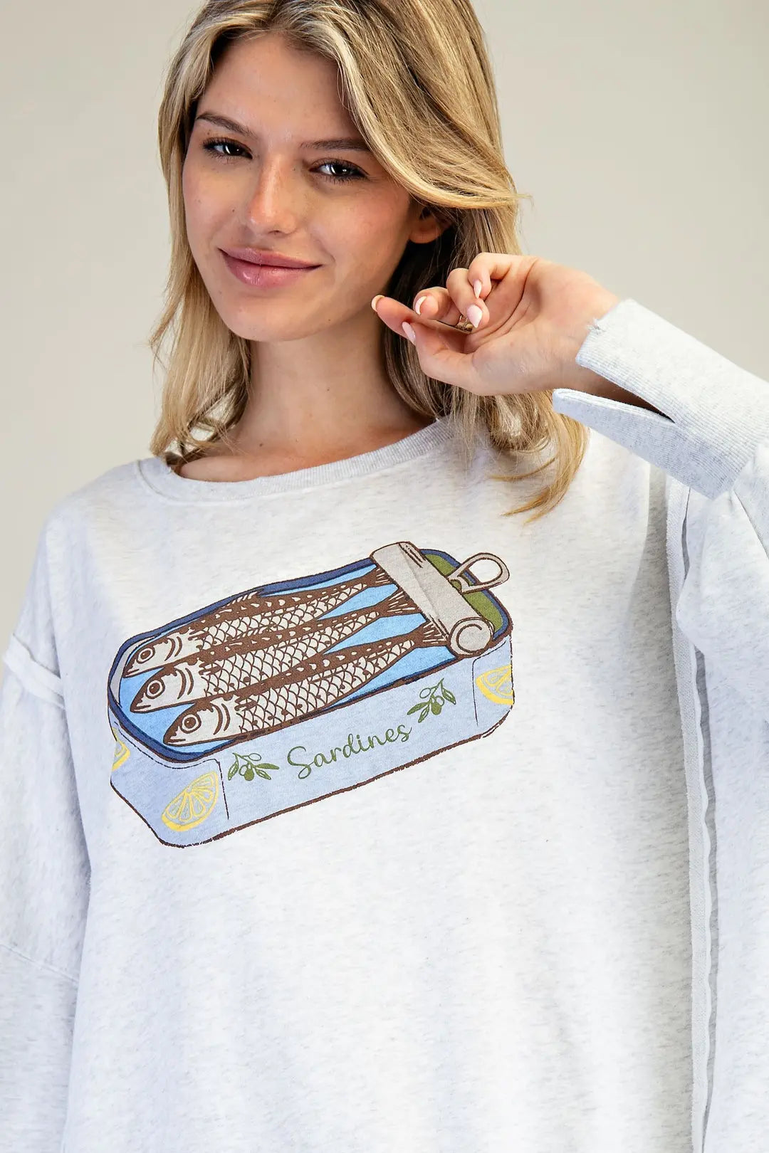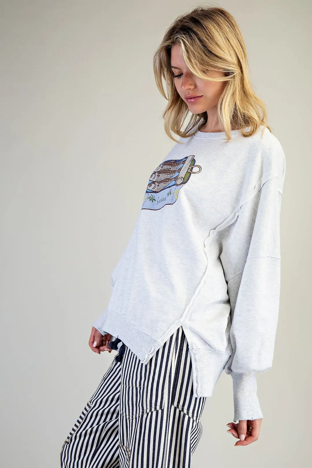 This oversized heather grey sweatshirt showcases a bold sardine can graphic at the chest, exposed raw seam detailing throughout, dropped shoulders with voluminous balloon sleeves, side slits with ribbed trim, and an easy relaxed fit for a playful yet laid back look.
