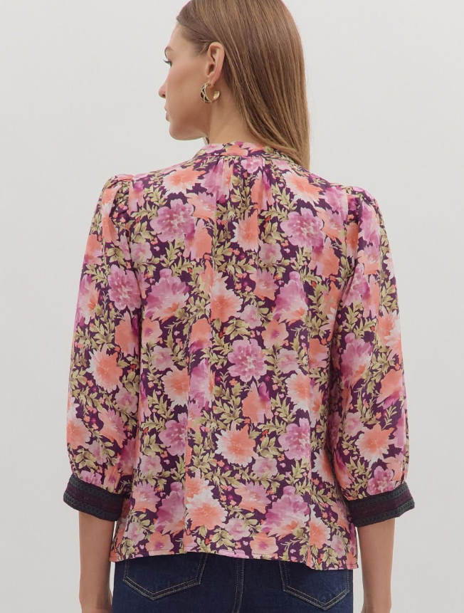 Elevate your wardrobe with this sophisticated floral print top, designed with refined details that balance comfort and style. The flattering V-neck and three-quarter sleeves provide versatile coverage, while contrast embroidered trim at the neckline and sleeve openings adds an artisanal touch. The intricate floral pattern brings visual interest to any ensemble, making this piece equally suited for casual outings or polished occasions. A timeless addition that transitions seamlessly across seasons.