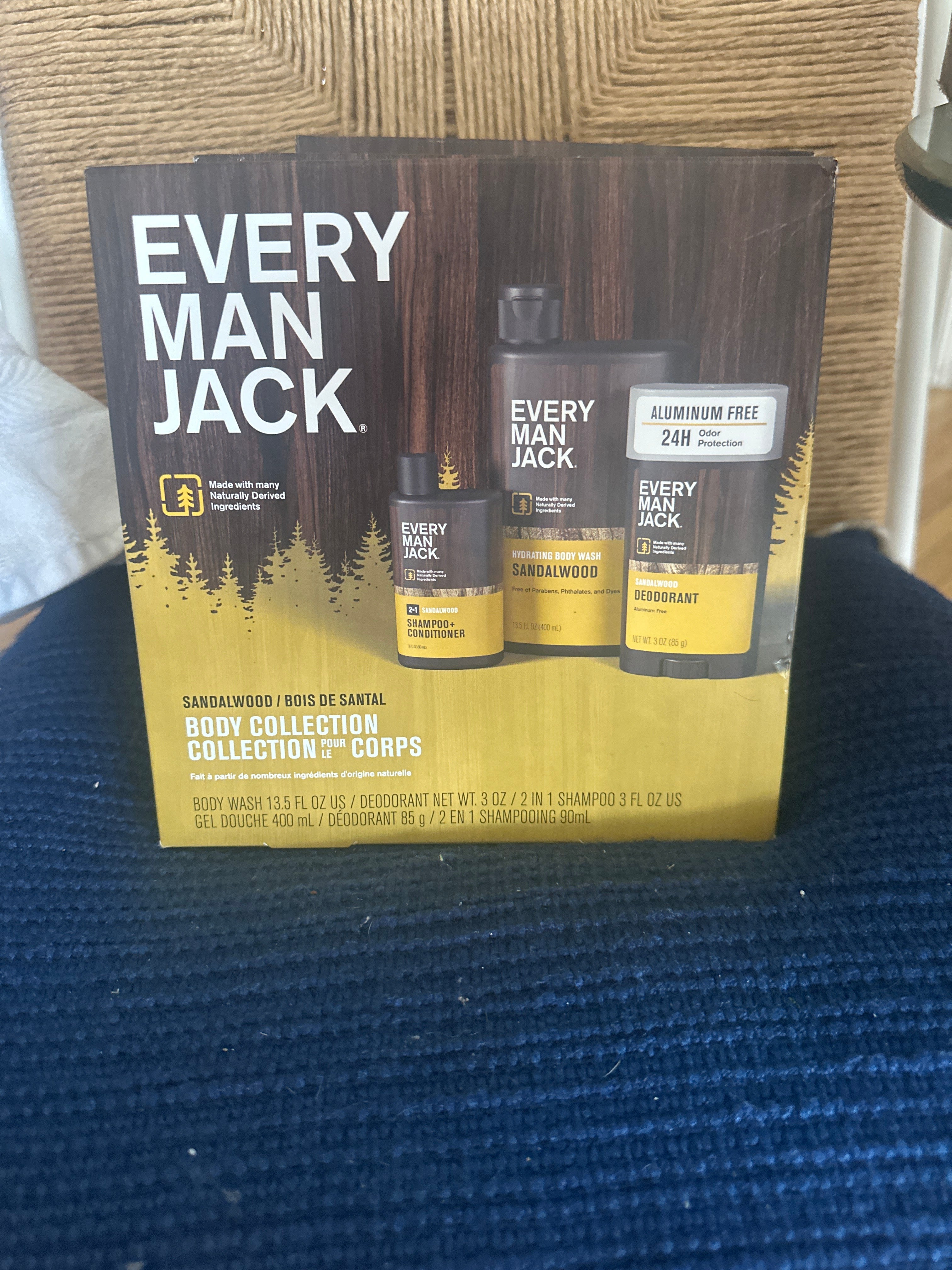 - Grooming essentials: Based on similar Every Man Jack gift sets, it likely contains items such as body wash, deodorant, and potentially hair care or beard care products.