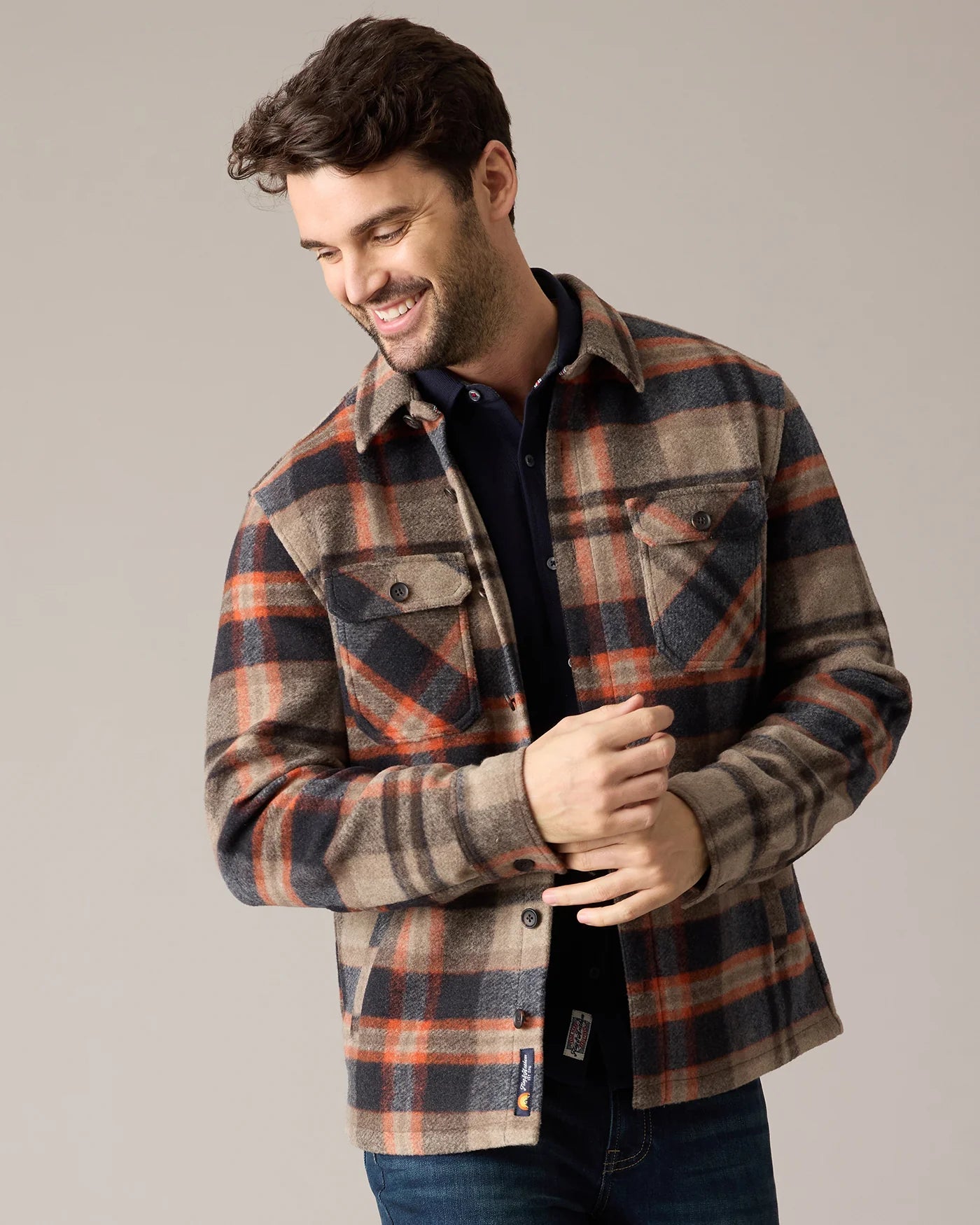 We took the everyday plaid shirt jacket and elevated it with a thick brushed fabric and an updated color combo. Grab this jacket when you need a substantial layer but not a full-on coat. Easy to layer over everything from button-down shirts to your favorite tee. Dual front flap pockets + angled slit pockets allow you to keep your essentials close and secure. Classic shirt collar; rubberized snap closures.