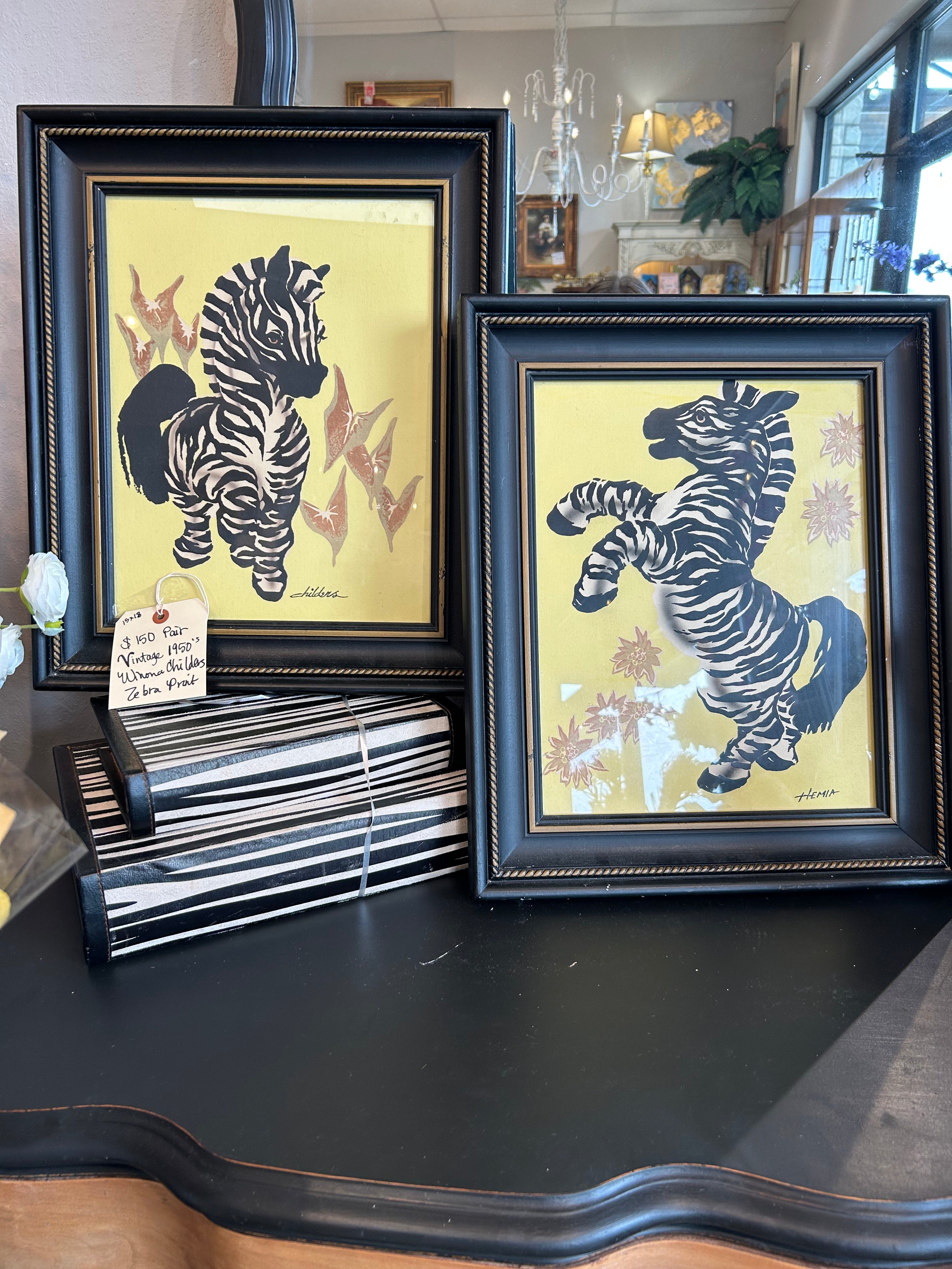 Rendered in deep black ink with expressive brushwork, these pieces feature proud zebras set against a warm mustard-gold background, accented with stylized flora that echos mid-century modern flair!