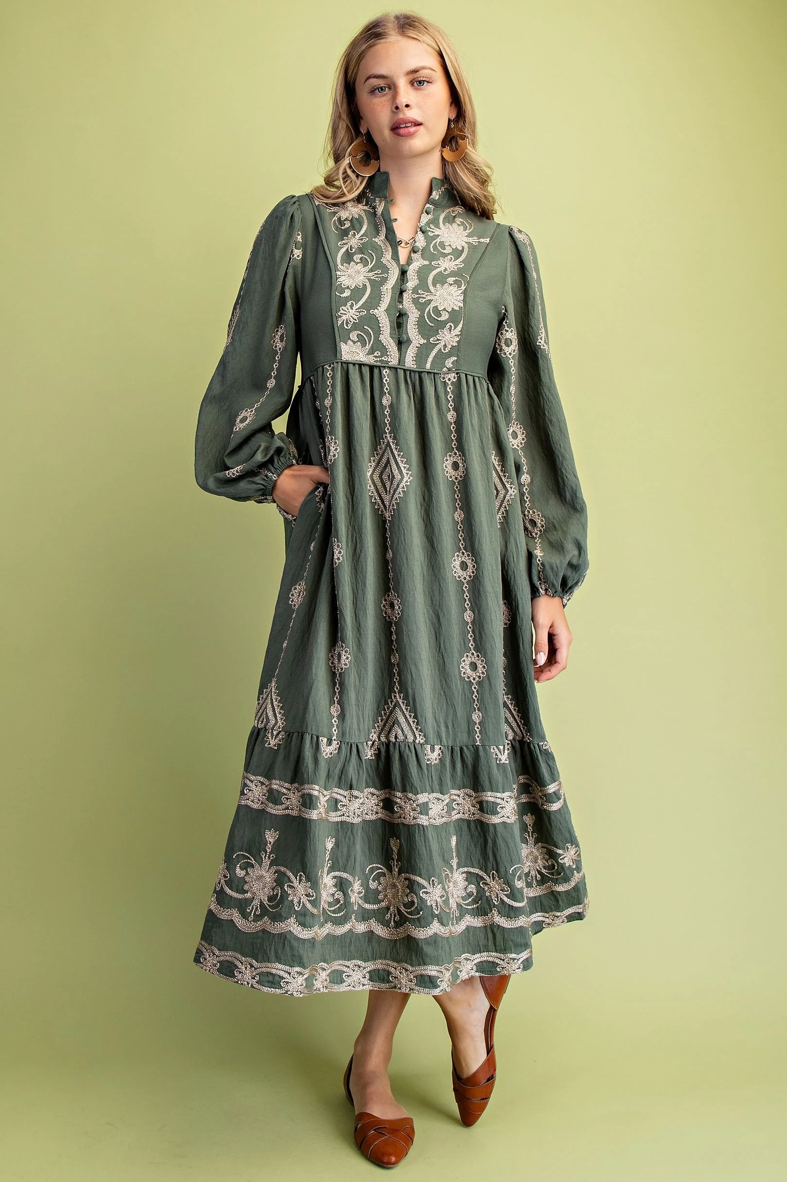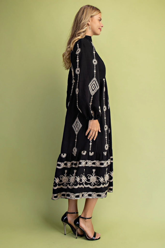 The GiGio Embroidered Button Top Midi Dress combines timeless elegance with contemporary flair. This midi-length piece features a flattering V-neckline and a full button front for effortless styling versatility. Intricate metallic embroidery adorns the bodice, adding sophisticated dimension and visual interest. The structured silhouette provides a polished look suitable for both professional settings and elevated casual occasions. Quality construction ensures durability through repeated wear and washing, making this dress a reliable addition to any wardrobe seeking refined, statement-making pieces.