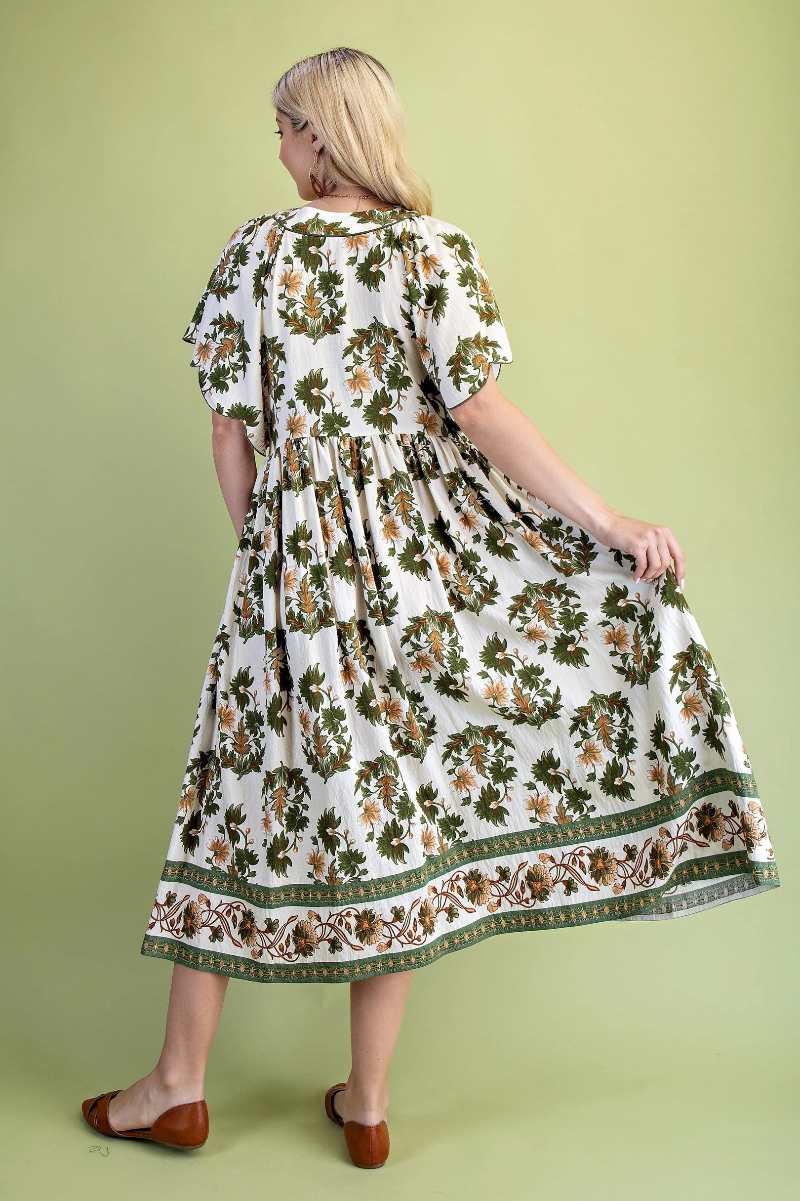 GiGio Fall Floral Printed V-Neck Midi Dress with Scalloped Short Sleeves