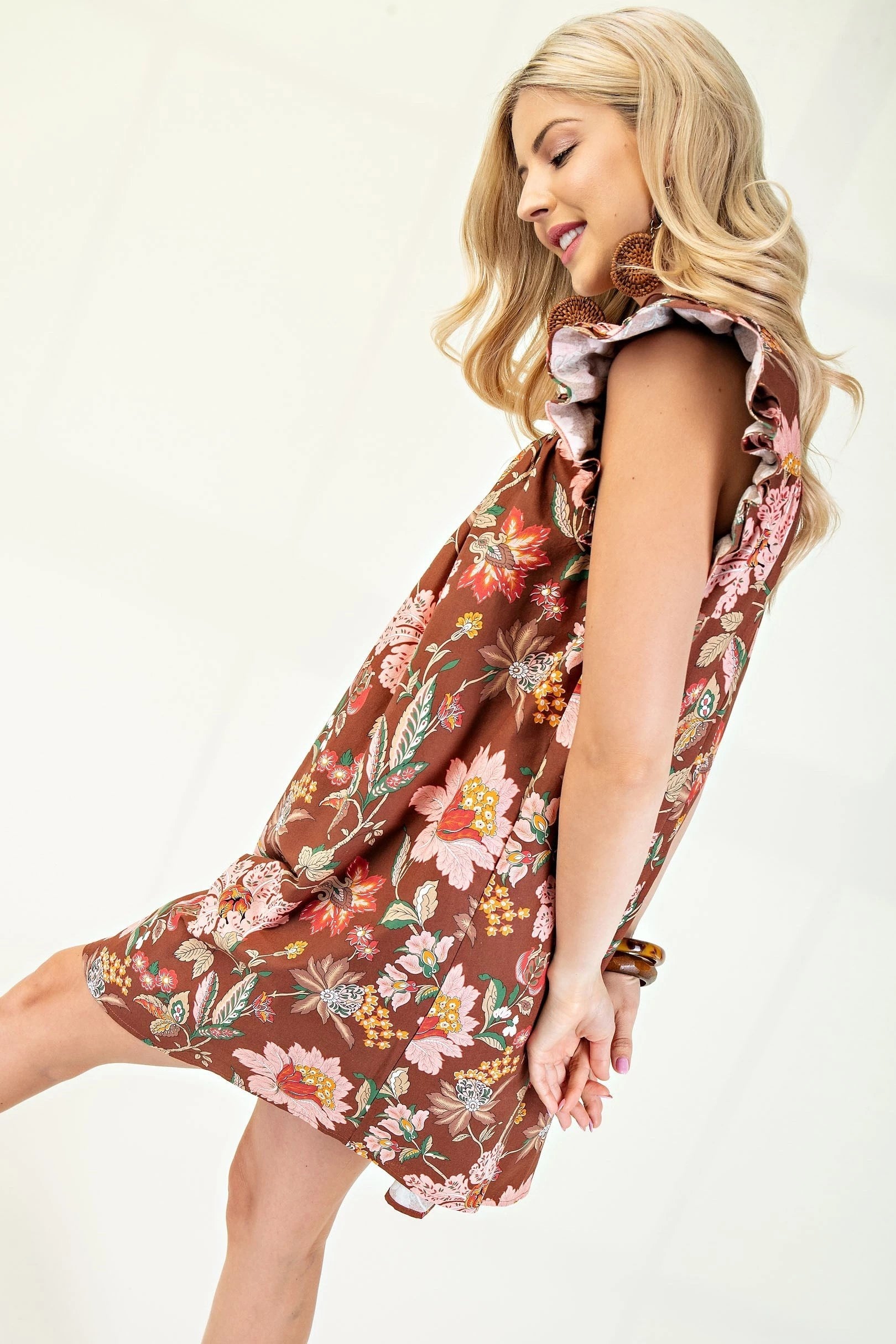 Step out in style with the GiGio Floral Split Neck Mini Dress, featuring charming ruffle sleeves and a flirtatious split neckline. Its vibrant floral print and breezy silhouette make every moment feel like a sunny day adventure. Perfect for playful outings or casual gatherings, this dress adds a fresh pop of fun to your wardrobe.
