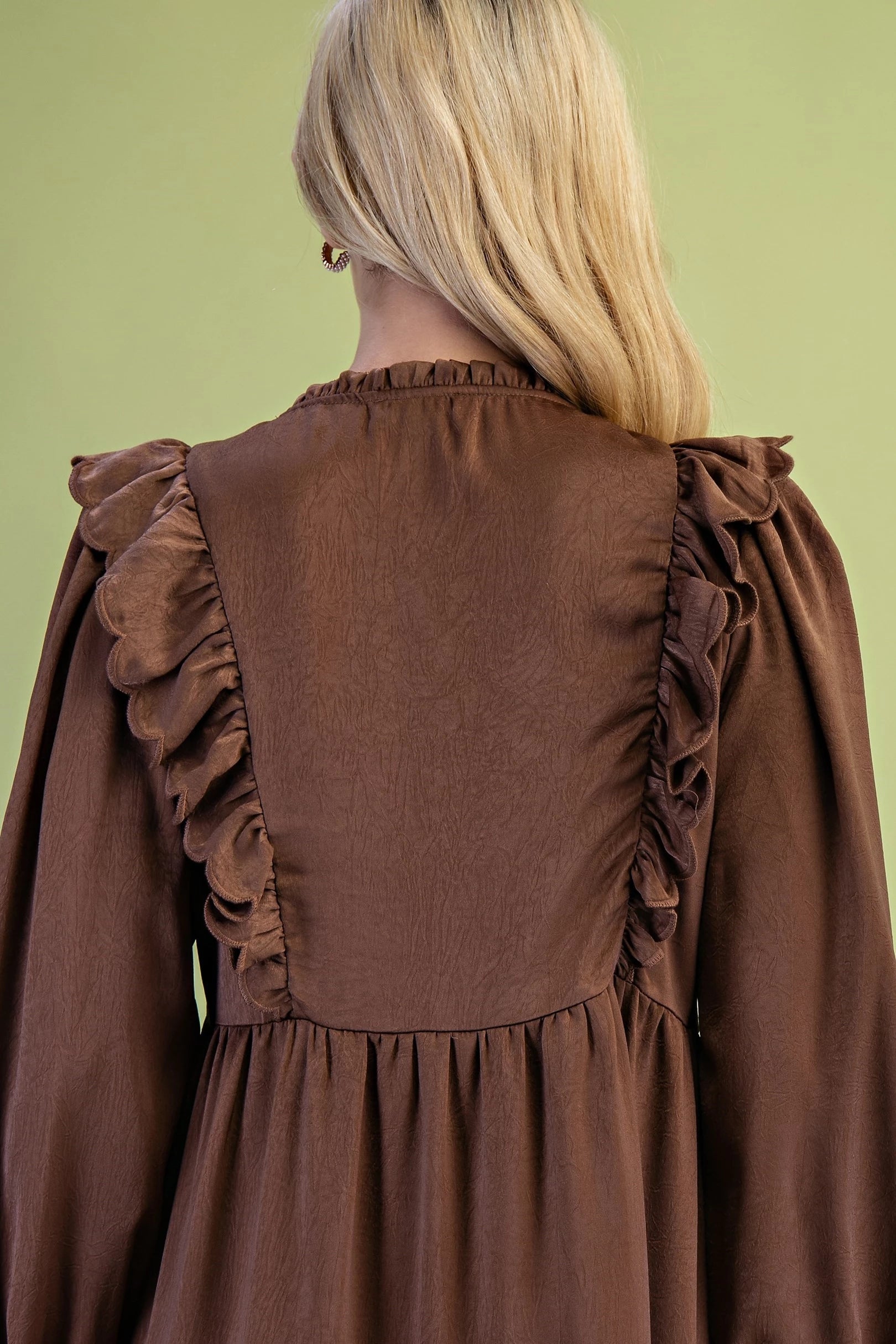 The GiGio Long Sleeve Tiered Dress combines sophisticated layering with refined detailing for an elevated everyday look. The tiered silhouette creates dimension and movement, while the pleated front adds structure and visual interest. Delicate scalloped ruffles along the hem provide a polished finish that elevates the piece from casual to versatile. Long sleeves offer coverage and elegance, making this midi dress suitable for various occasions—from professional settings to weekend outings. The thoughtful construction ensures a flattering fit that works across different body types.