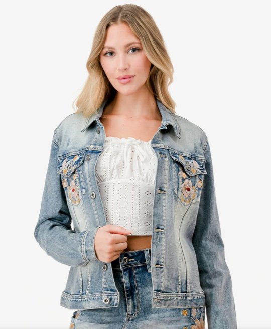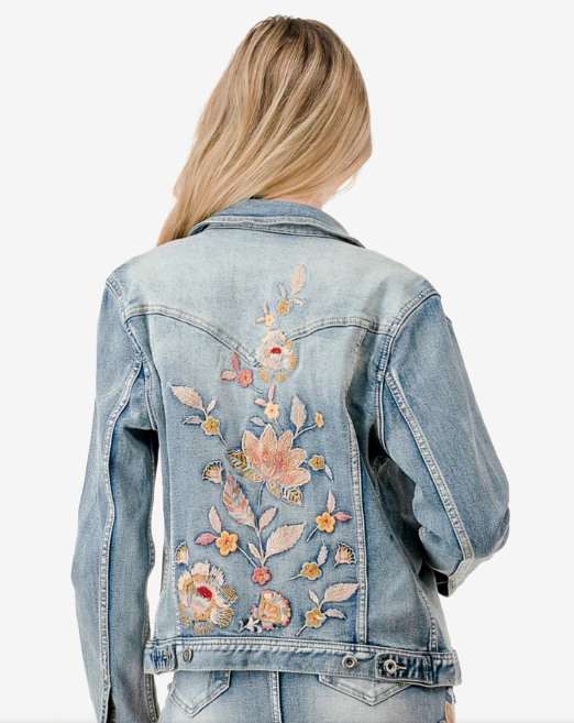 Add the perfect touch of femininity and style to your outfit with the Grace in LA Floral Embroidered Jacket. This denim jacket is adorned with gorgeous floral embroidery, making it a must-have for any wardrobe. Perfect for a retail store, this jacket is a staple for all fashion lovers.