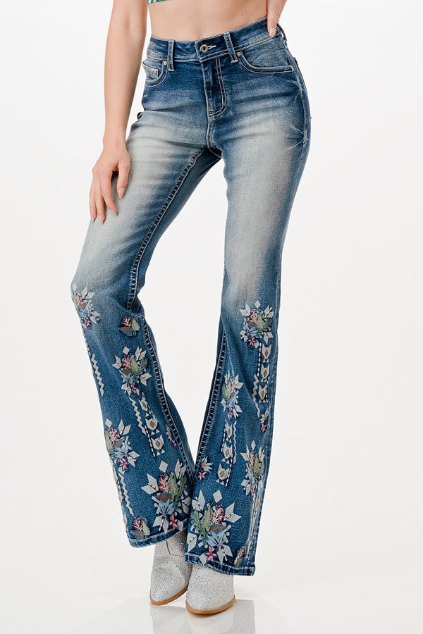 Grace In LA Highwaist Flare Western Floral Embroidered Jeans