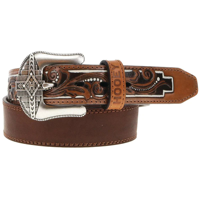 This Hooey classic men's belt features brown distressed leather, detailed Aztec filigree embossed with billets and ivory accents.