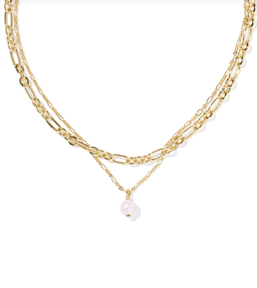 The layered look is easy to achieve with the Ashton Gold Multi Strand Necklace. Two figaro chains and a freshwater cultured pearl combine to create a beautiful necklace with an adjustable length, perfect to wear on its own or with your other favorite pieces.