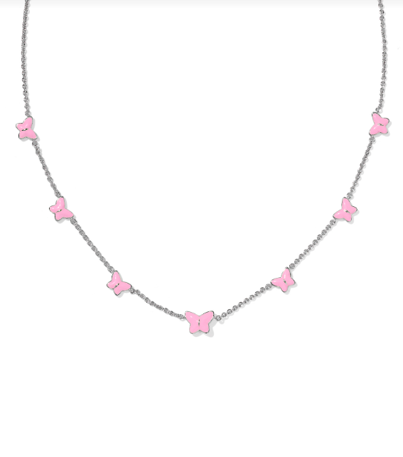 Add a sweet bit of shine to your necklace collection with the Lillia Butterfly Silver Enamel Strand Necklace. Featuring butterfly accents on a dainty chain, this choker-style necklace pairs perfectly with your other layers or can fly on its own. This style honors the strength and resilience of those affected by breast cancer. 20% of the purchase price from these select styles benefit The Kendra Scott Foundation to help fund breast cancer awareness and research efforts year-round.