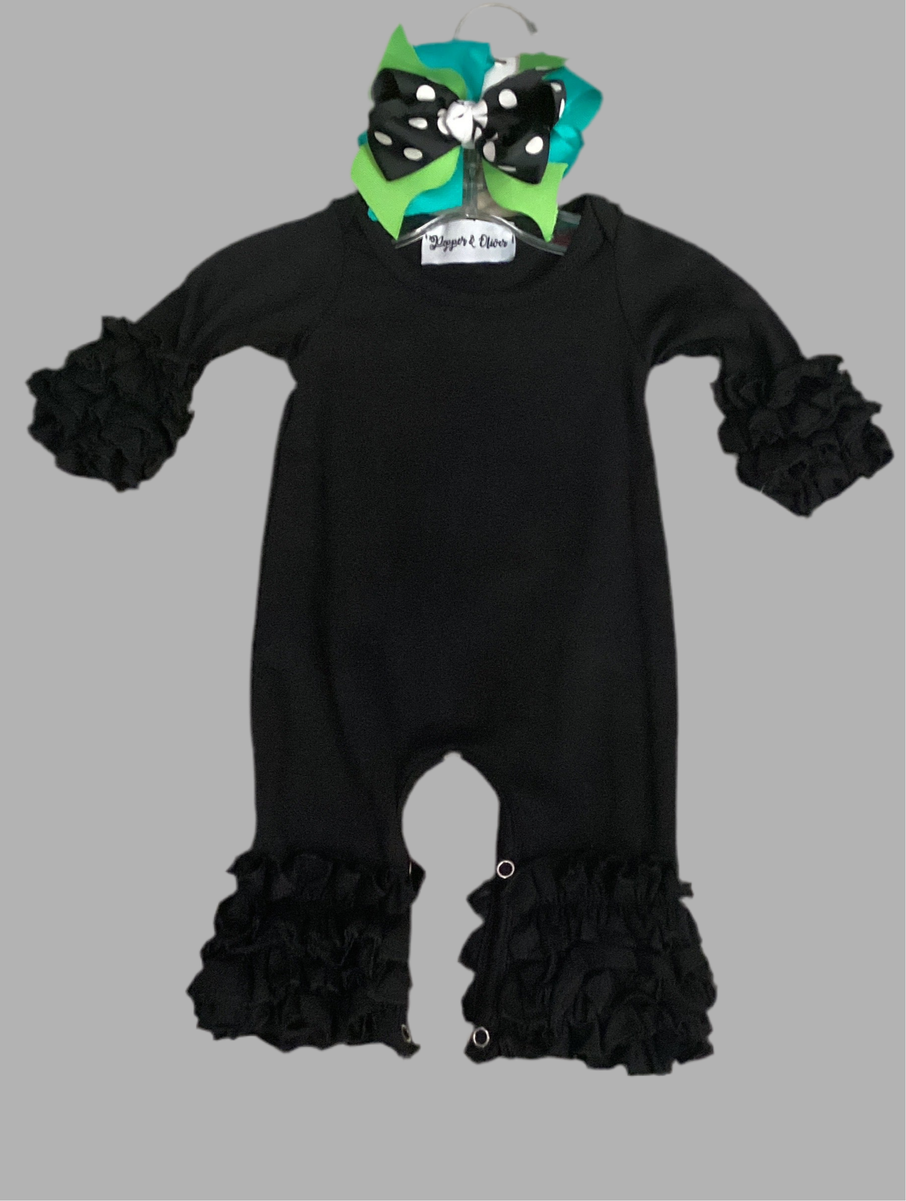 Dress your little one in comfort and style with the P&O Icing Long Romper in black cotton. This playful romper offers a soft, breathable fit perfect for all-day fun and play. Optional monogramming adds a personalized touch, making it a unique favorite for your little girl's wardrobe. Easy to wear and effortlessly cute!