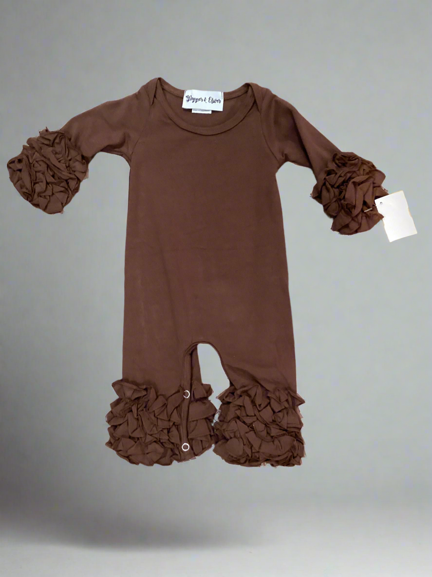 Elevate your little one's style with our P&O Icing Long Romper~Brown. Made with soft cotton and available for optional monogramming, this romper adds a touch of elegance to any outfit. Perfect for special occasions or everyday wear.