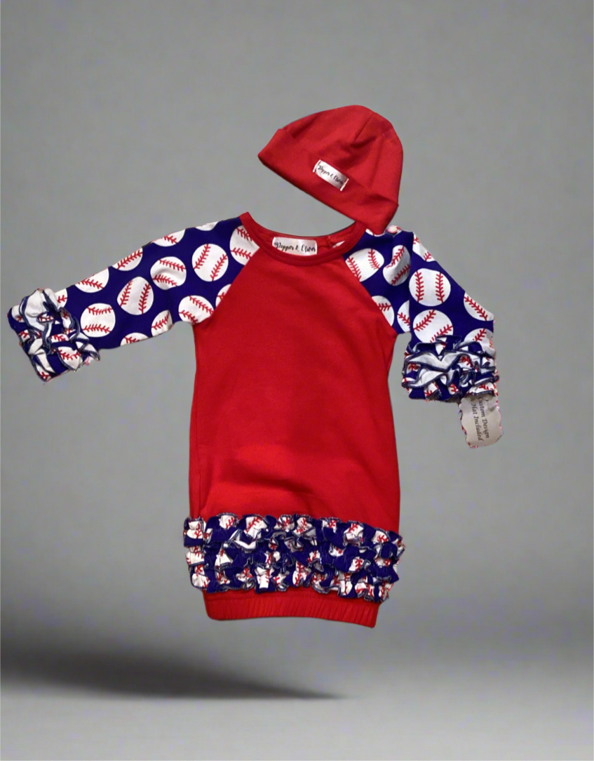 Made from soft cotton, the P&O Preemie baseball~Ruffle Gown is perfect for your little one's delicate skin. With the option to personalize, this gown is not only stylish but also customizable. Give your preemie the comfort and style they deserve.
