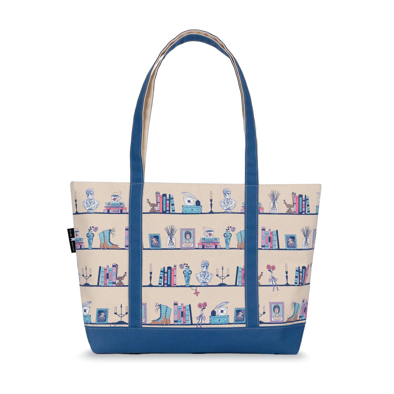 Generously sized and durably made, this 100% cotton canvas tote features a printed bookshelf filled with books and clever Pride and Prejudice references. Features one inner pocket and a 4" gusset. Straps have a 12" drop for shoulder wear. Zip top. Made in USA.