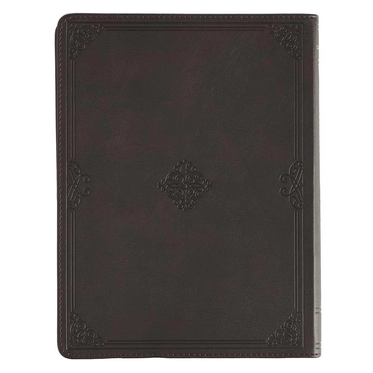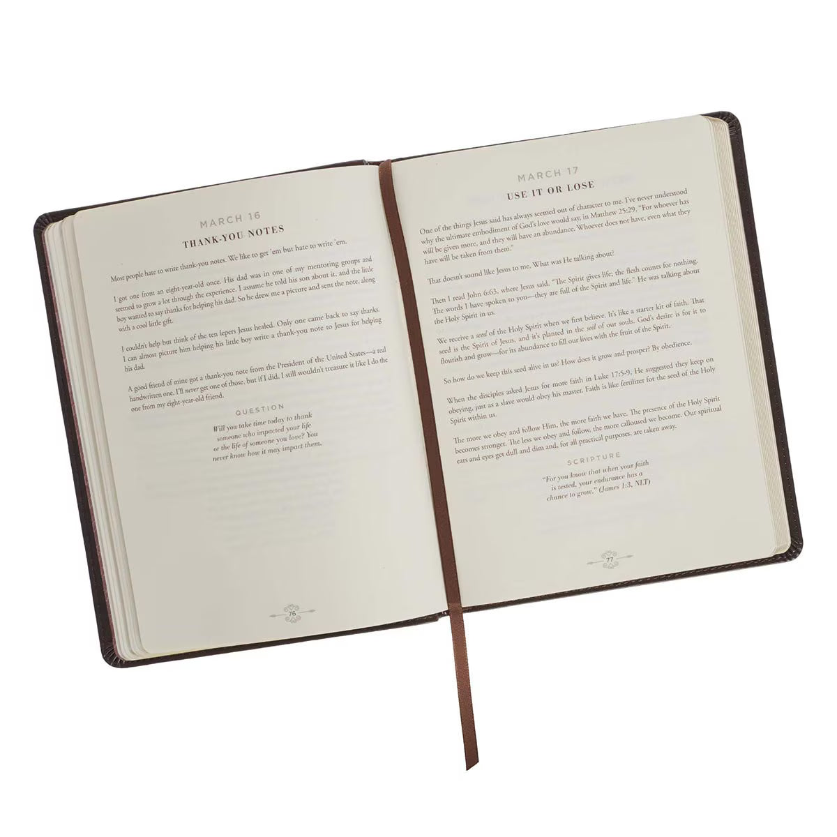 The devotional's rich brown faux leather cover is embellished with a subdued heat-debossed frame with heat-debossed corner scrolls. The gold-foiled title is sandwiched between two flourishes and matches the gold-foiled subtitle right below it.