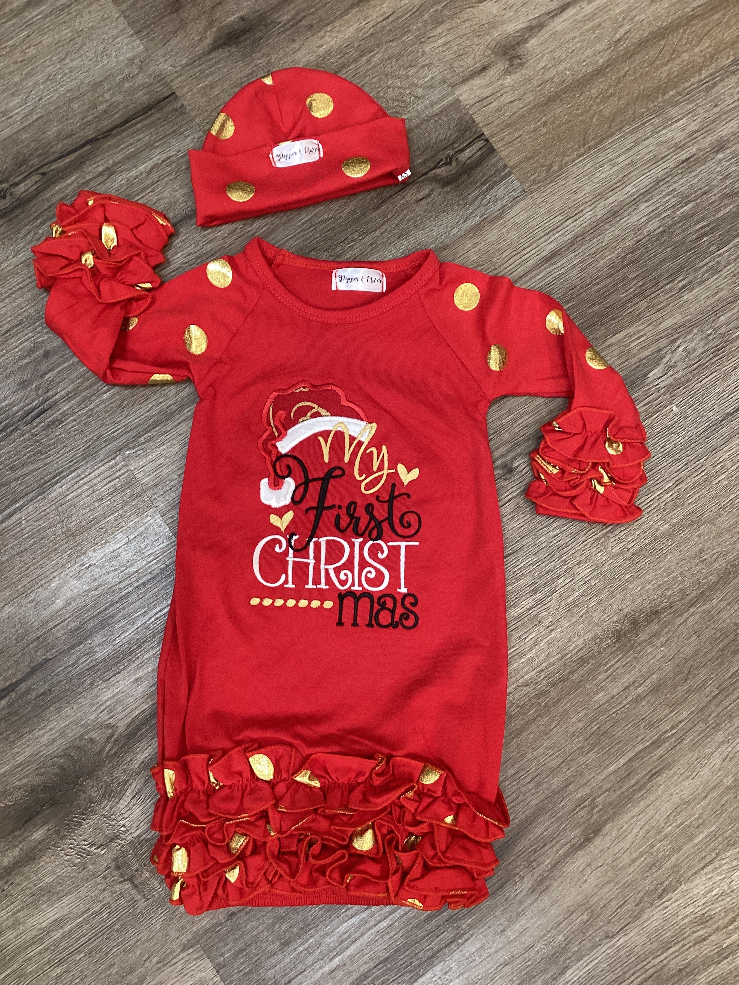 This darling newborn gown is a MUST for her very FIRST Christmas! This outfit makes for the PERFECT outfit for your sweet newborn and would make the cutest outfit for Christmas, Christmas photos, Christmas Parties and more! Perfect for baby showers, gender reveals and more!