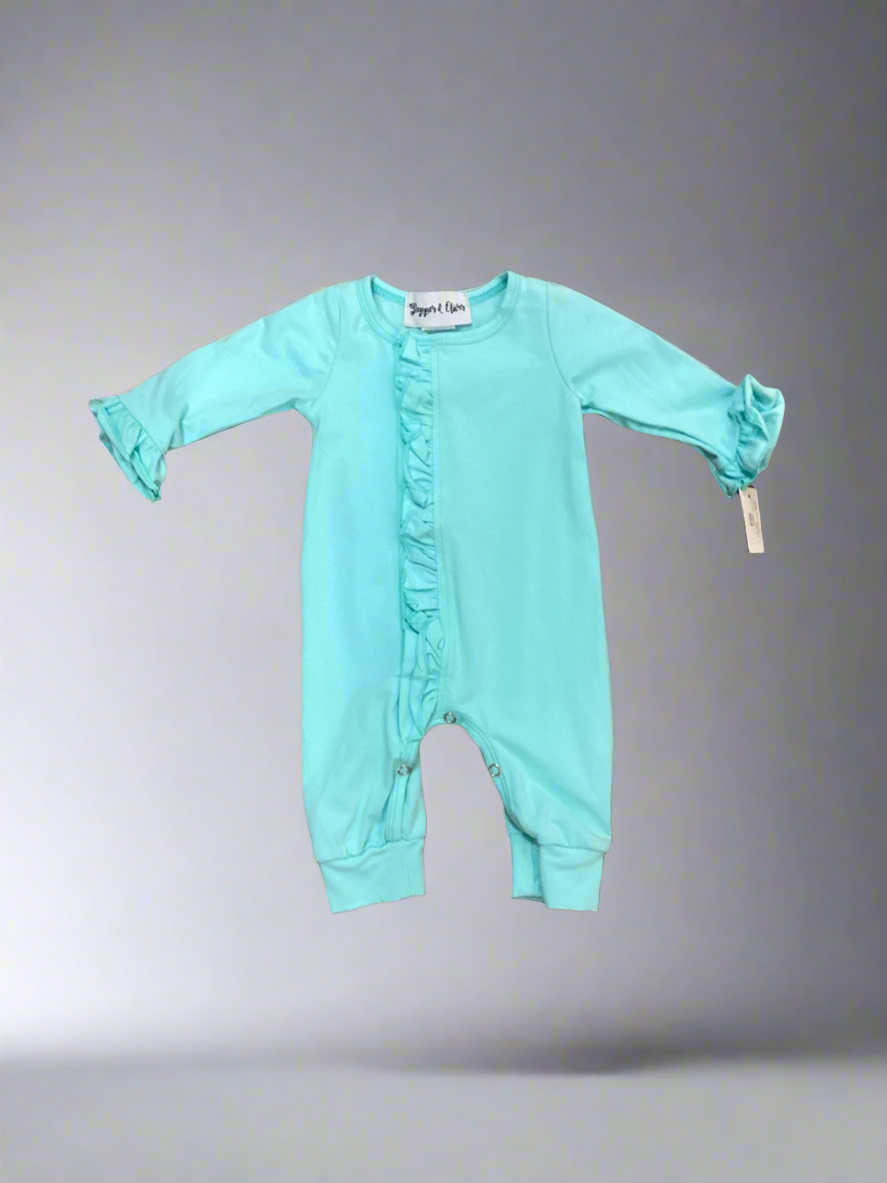 This light aqua ruffle zipper romper is made of soft, breathable cotton, providing maximum comfort for your little one. The convenient zipper design makes for easy and quick diaper changes. Keep your baby stylish and comfortable with this must-have romper.