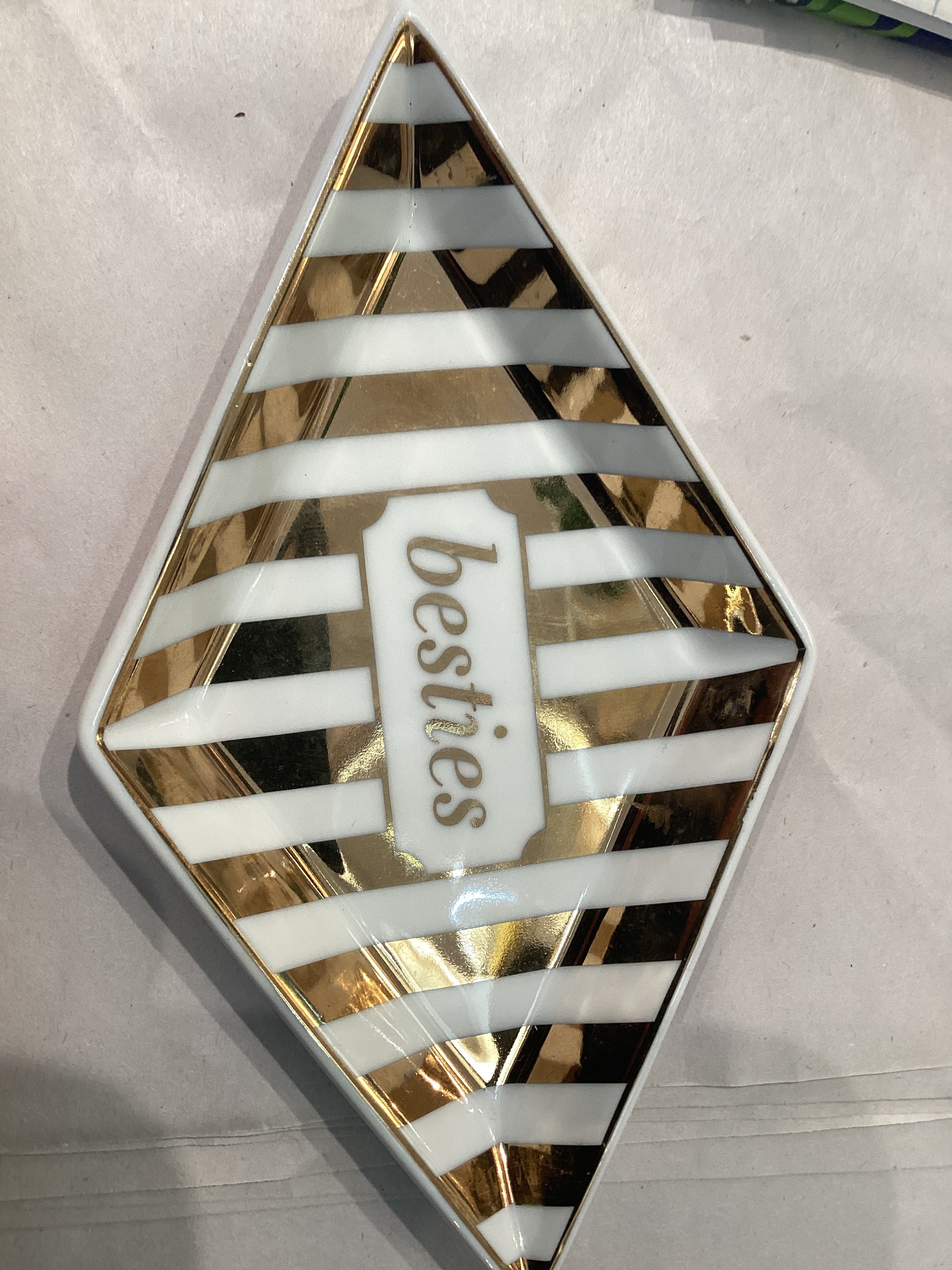Stripped white & gold~Besties~Diamond shaped Trinket Dish