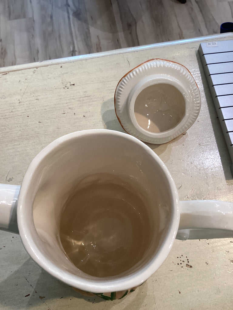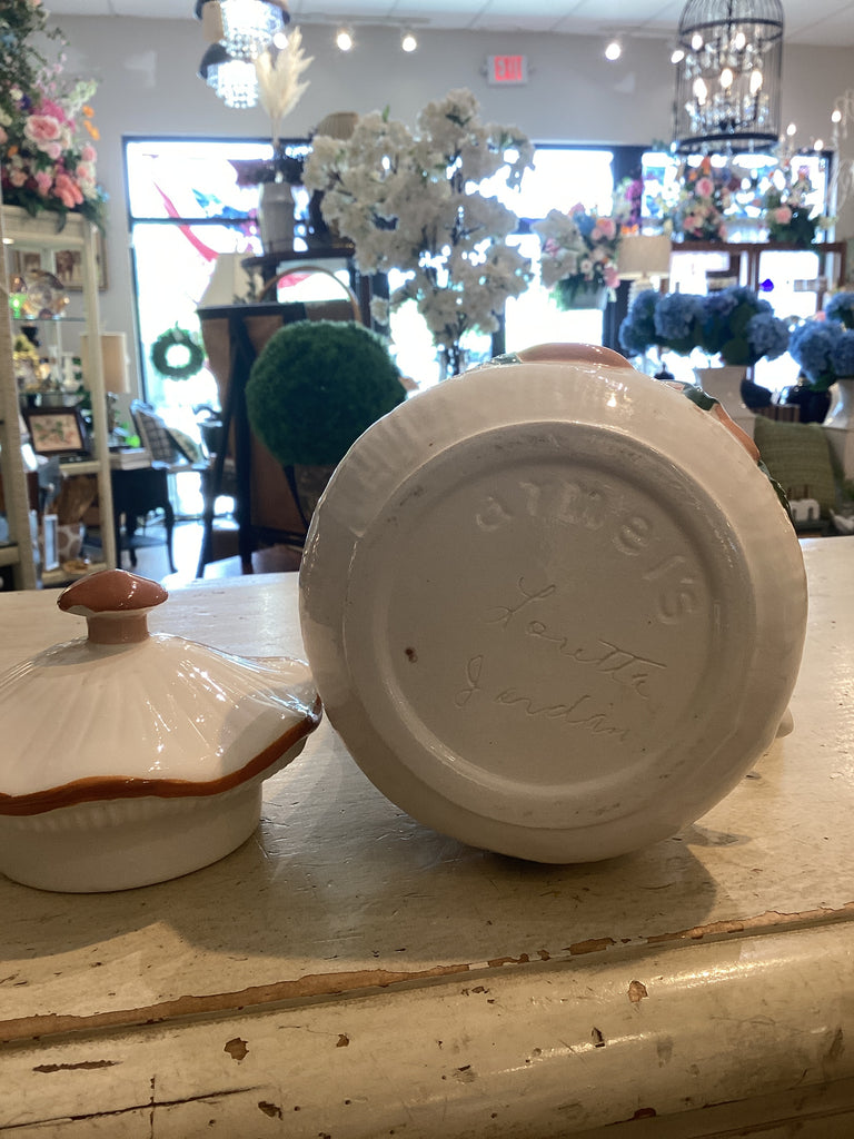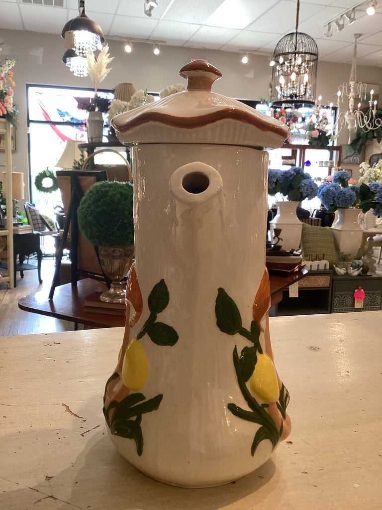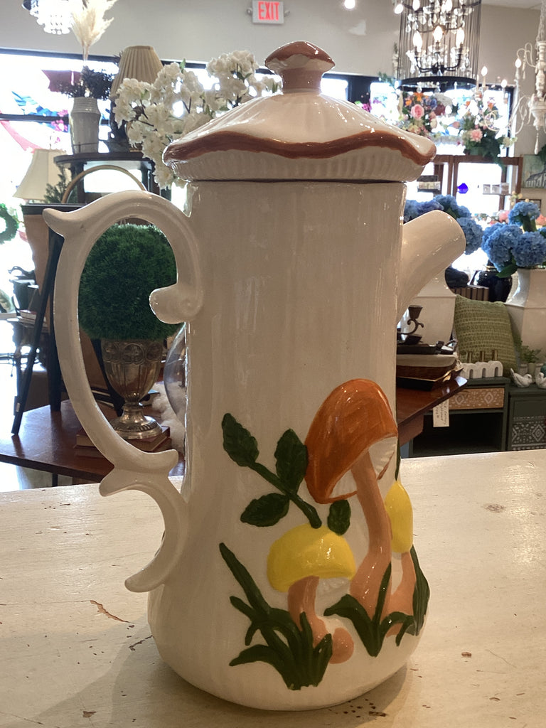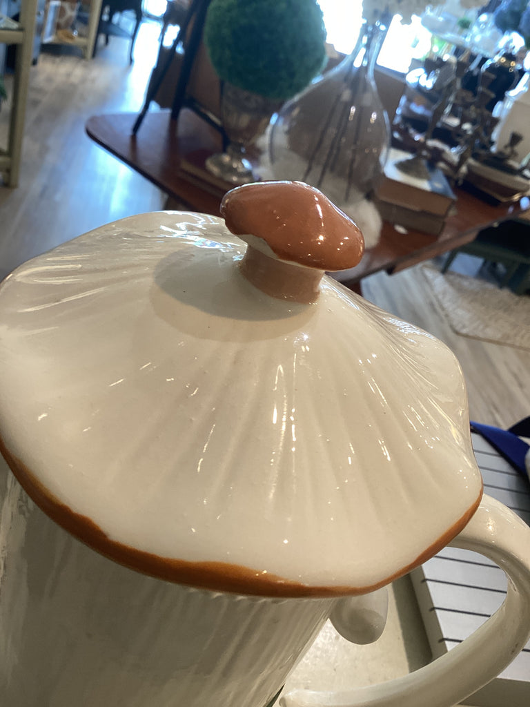 This Vintage Arnel’s Mushroom Teapot features an off-white base accented with brown trim, adding a charming rustic touch to your collection. Please note, there is a chip on the lid, so be sure to examine it carefully. Perfect for collectors or as a unique decorative piece.