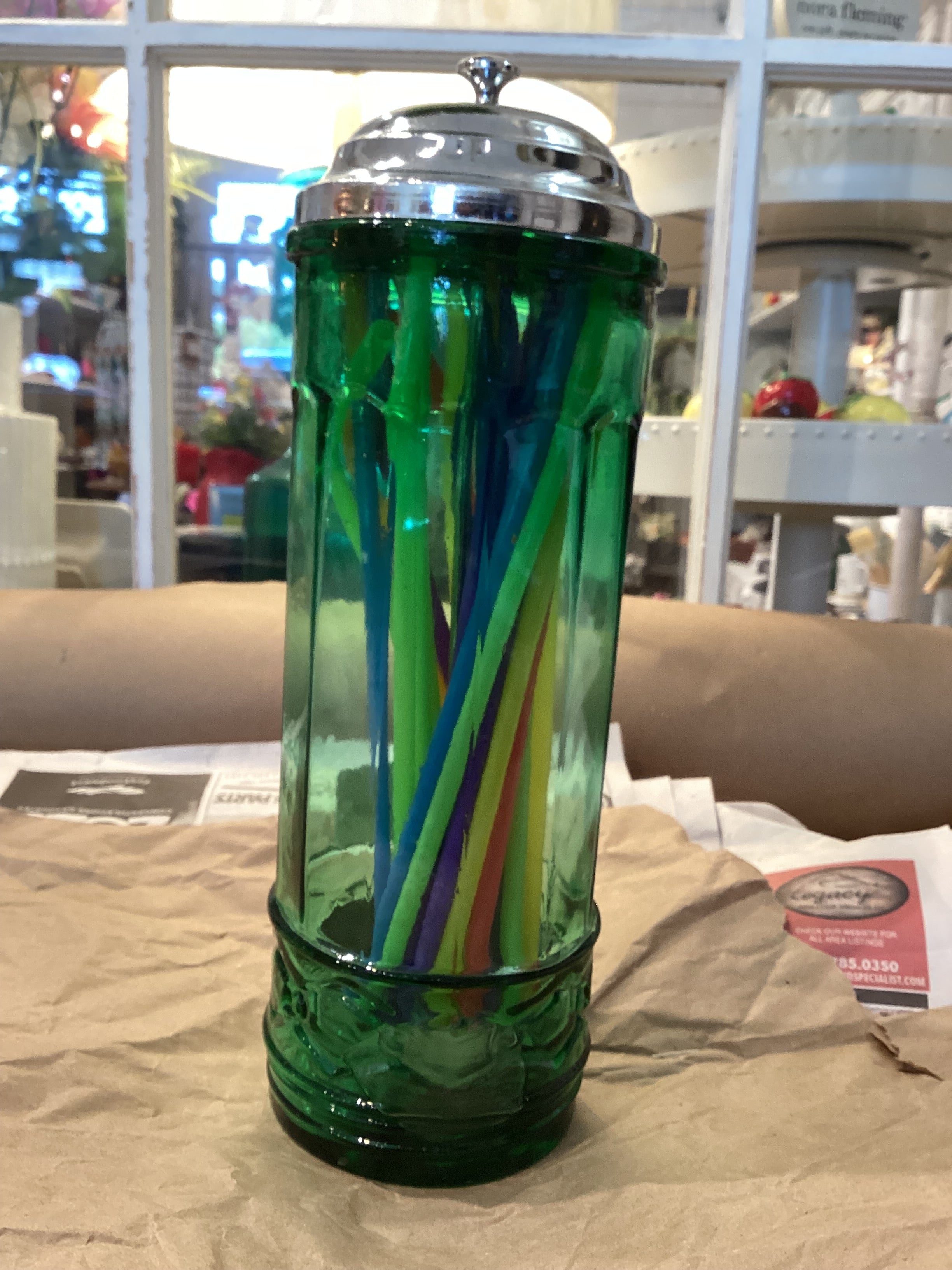 This vintage green glass straw holder is a perfect addition to any kitchen or dining room. Made from high-quality green glass, it adds a touch of elegance and nostalgia to your drinking experience. With its durable construction and stylish design, it's the perfect way to store your straws and reduce plastic waste.