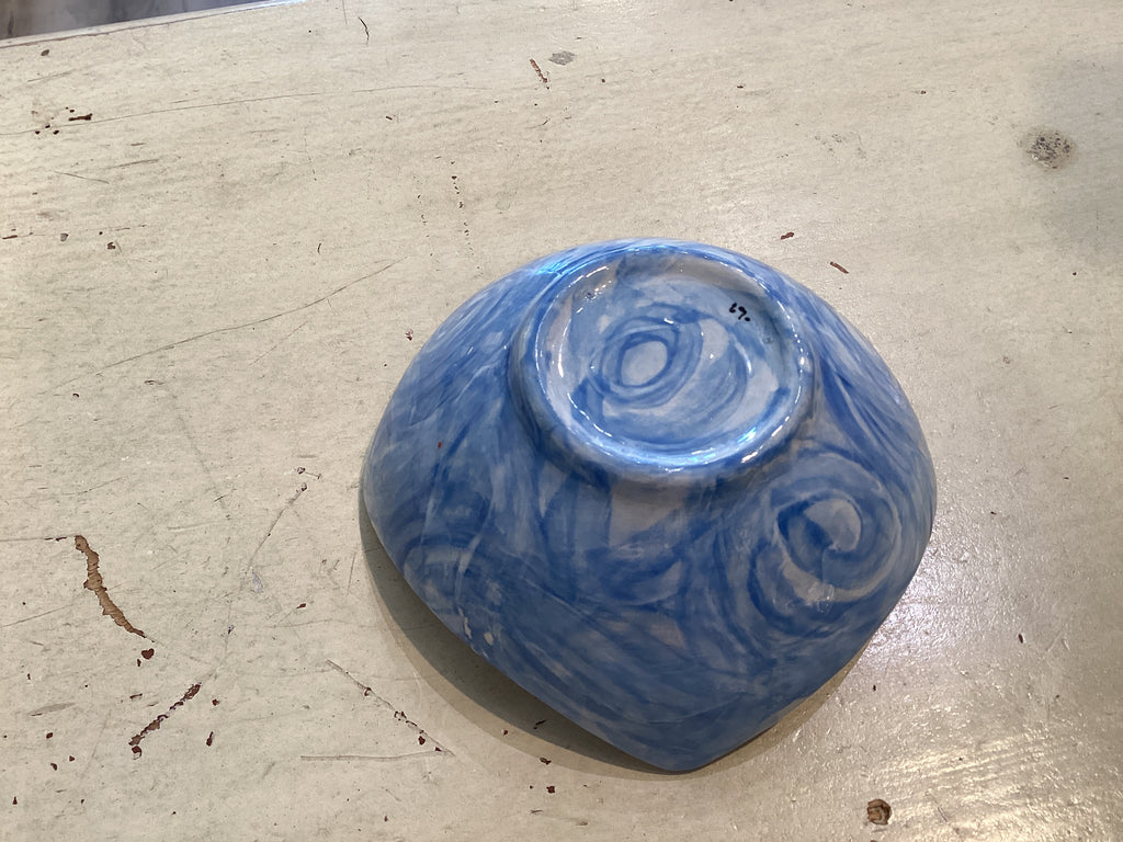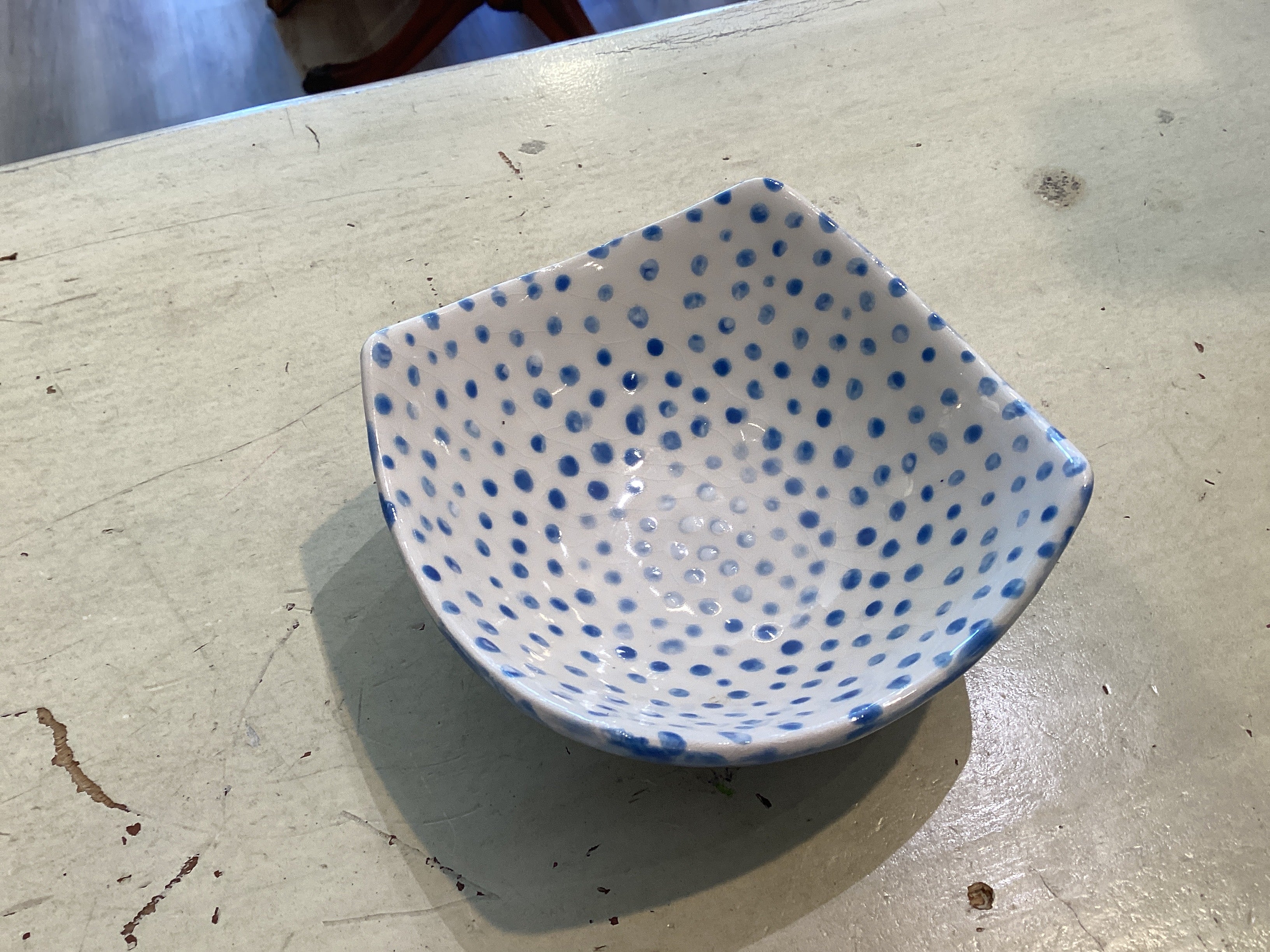 Express your whimsical nature with this handcrafted blue polka dot dish. Each piece is unique, made by a skilled artisan. Add a pop of color to your tableware and serve your guests in style. Elevate your dining experience with this one-of-a-kind bowl.