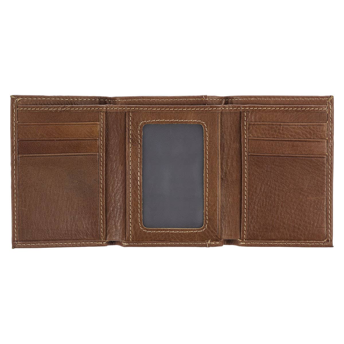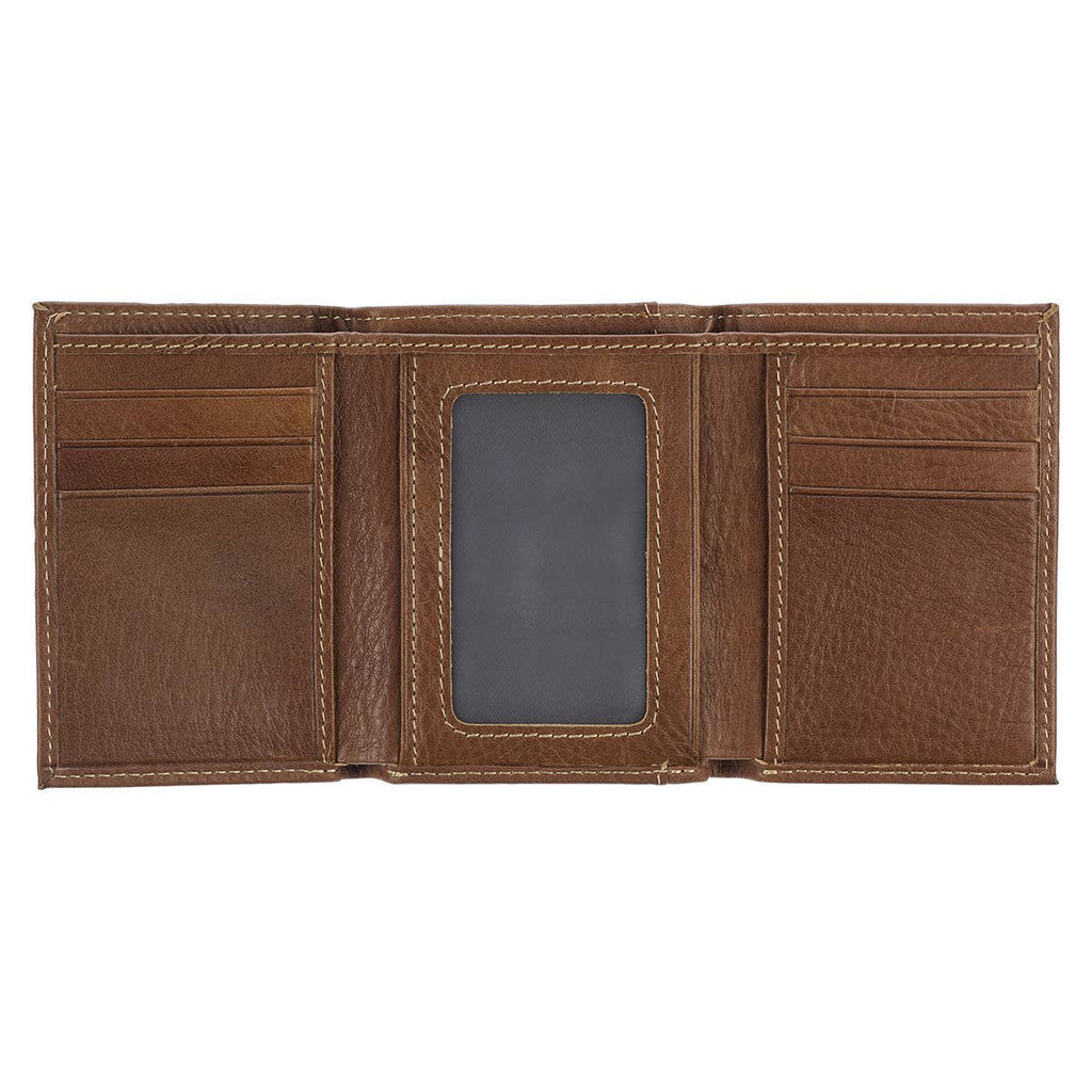Brown design with an ichthus fish brass badge, Genuine leather, Topstitched, Trifold, Back slip pocket, 2-section billfold, 2 interior multi-purpose slip pockets, 6 interior credit card slots, RFID-blocking technology, See Leather Care Guide for maintenance, Wipe with a damp cloth to clean, Packaged in a gift box, Wallet Size: 4.3” x 3.3” x 0.9” (109 x 84 x 23mm) Gift Box Dimensions: 5.2” x 3.9 ” x 1.3” (131 x 100 x 34mm)