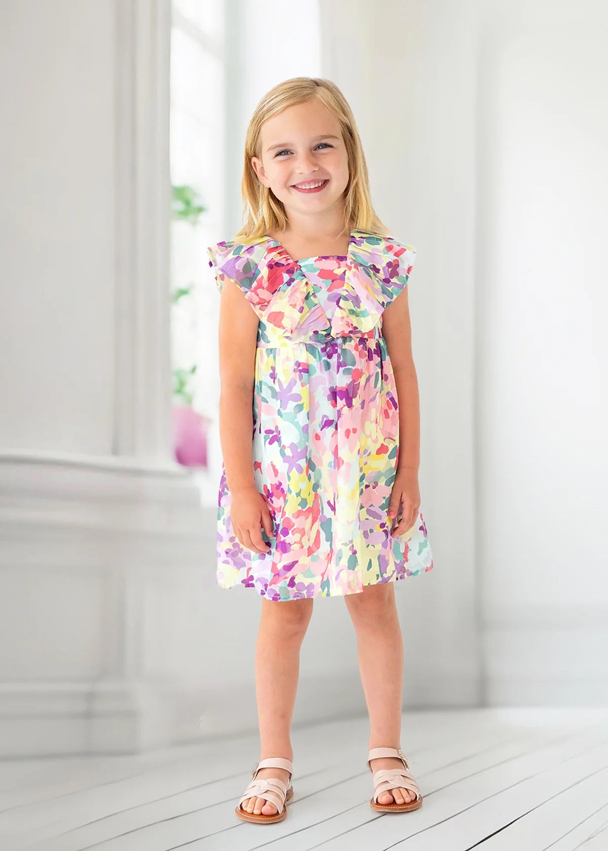 This dress features a colorful floral print in shades of pink, purple, yellow, and green on chiffon fabric. Designed with ruffled flutter sleeves, V-neck back detail, and a gathered waist for a sweet look. it combines style and comfort. The elastic cross back detail provides a flexible fit, while the pastel hues add a playful and fresh touch.