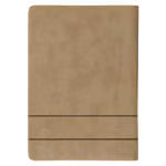 A smooth tan faux leather cover is gently mottled to resemble vintage suede leather. Two heat-debossed horizontal bands accented with tan topstitching stretch across the journal's bottom half. The heat-debossed sentiment is centered on the front cover.